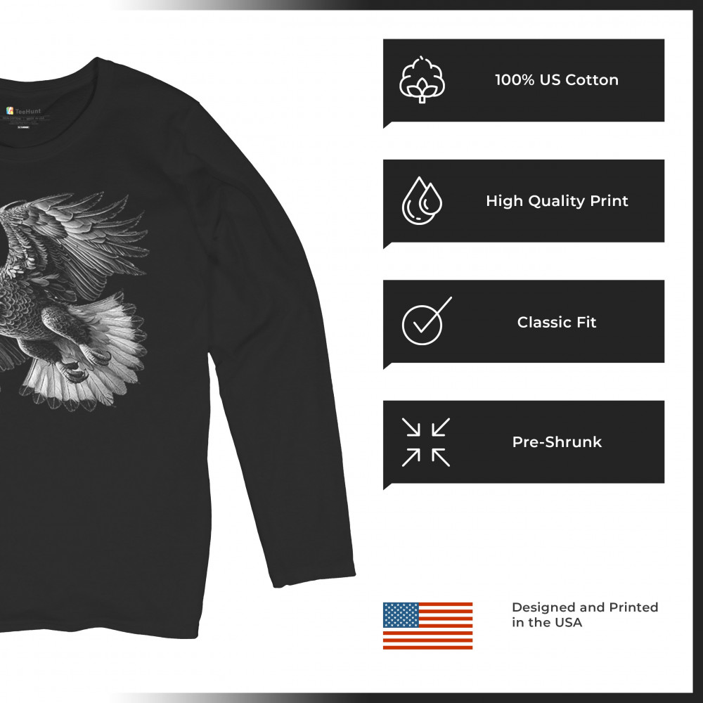 Celebrate American pride with this soaring bald eagle design. With wings extended and monochrome detail that symbolizes liberty and strength, it's perfect for patriots, veterans, and national holiday wear. A timeless tribute to freedom, this design is ideal for memorial events, rallies, and anyone who honors the red, white, and blue.