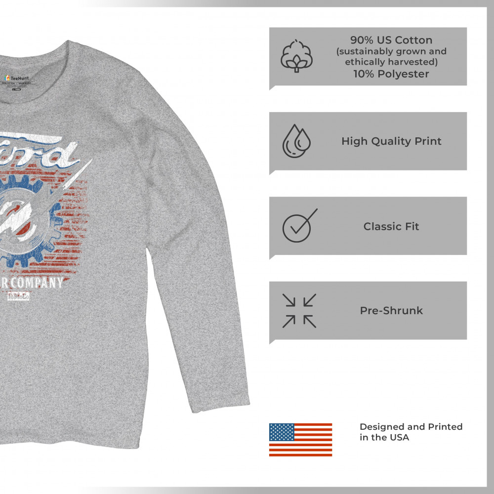 Honor Ford Motor Company’s legacy with this officially licensed vintage design, featuring a lightning bolt, distressed flag, and FoMoCo heritage.