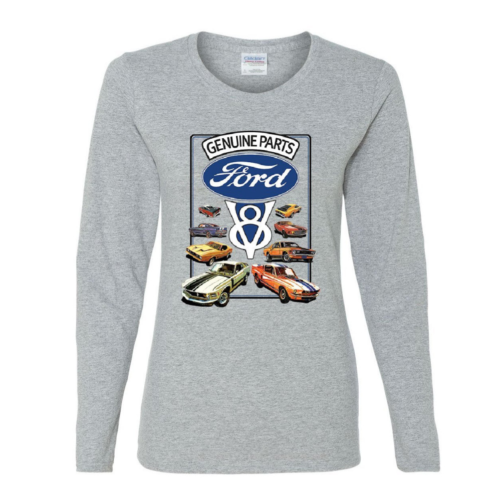 FORD GENUINE PARTS women's long sleeve tee american classic muscle cars v8 motor gray