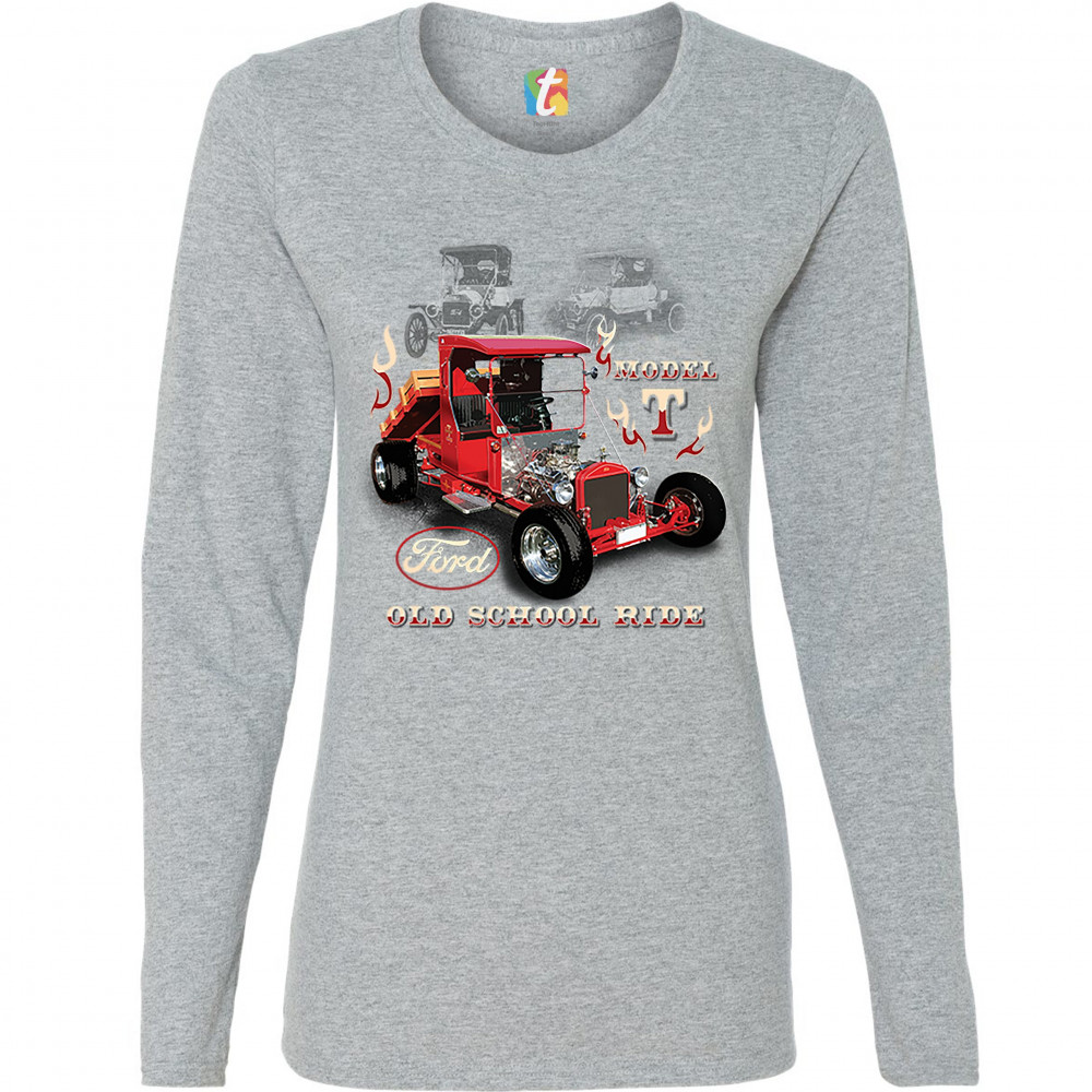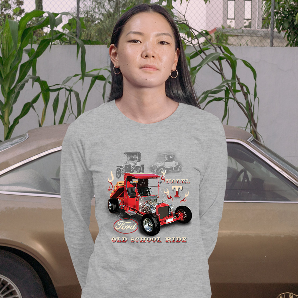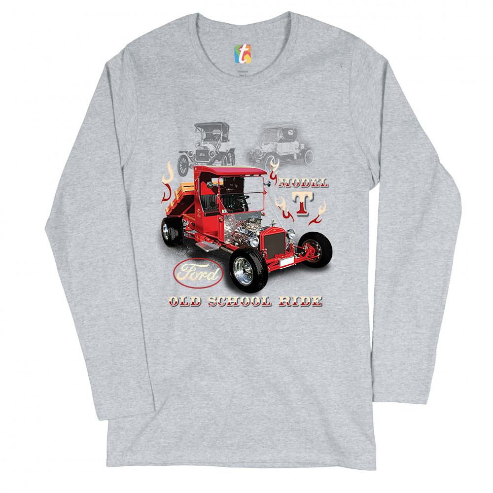 A print featuring a Ford Model T modified as a hot rod. The are also two transparent pictures of original T Models in the background. The print features the Ford logo and says: "Model T, Old School Ride". A great choice for anyone who is a fan of old sch
