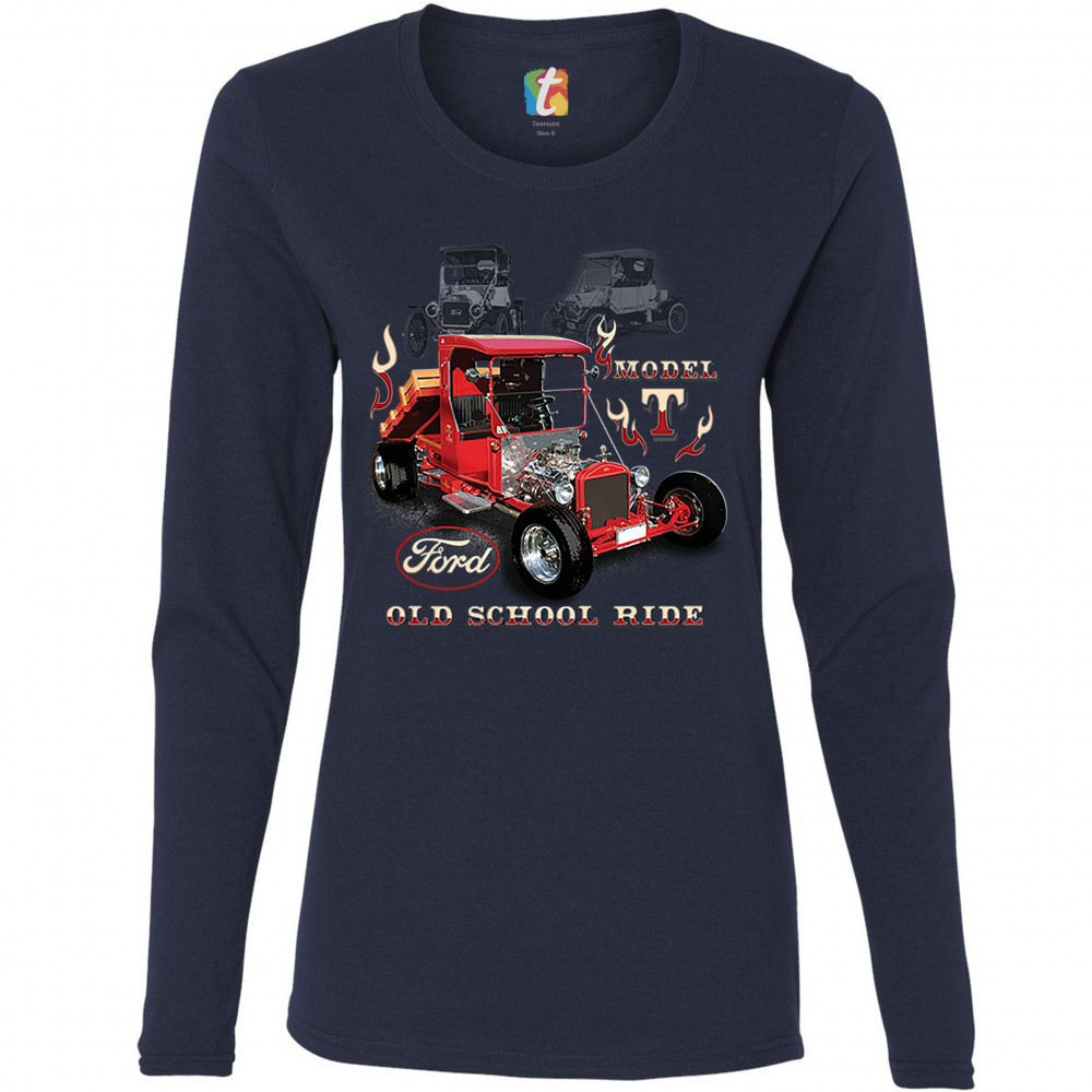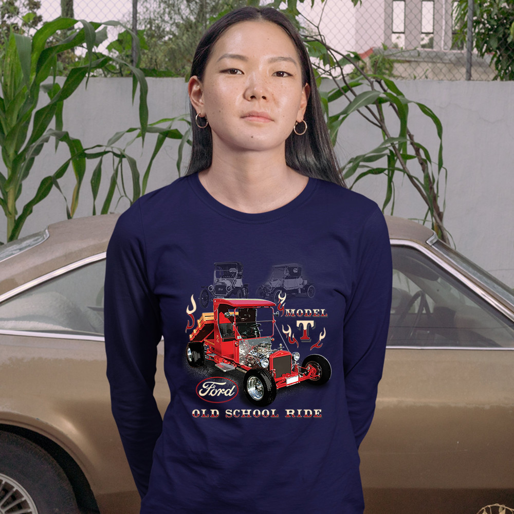 FORD MODEL T OLD SCHOOL RIDE women's long sleeve t-shirt retro hot rod licensed navy blue