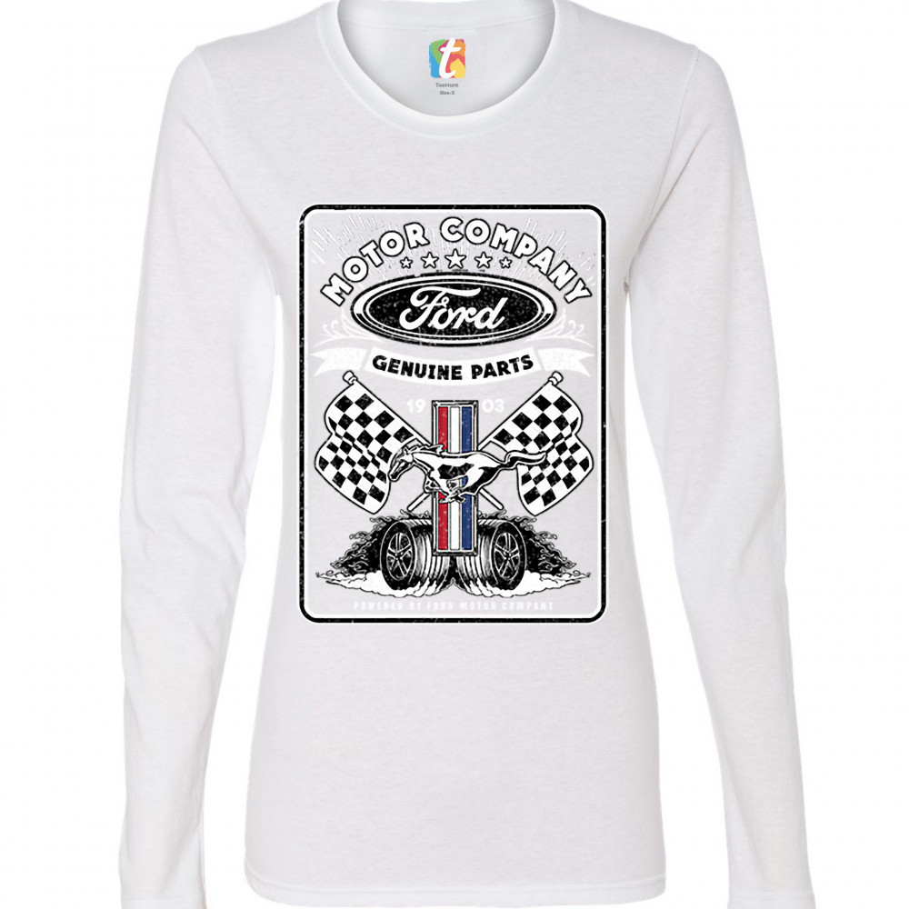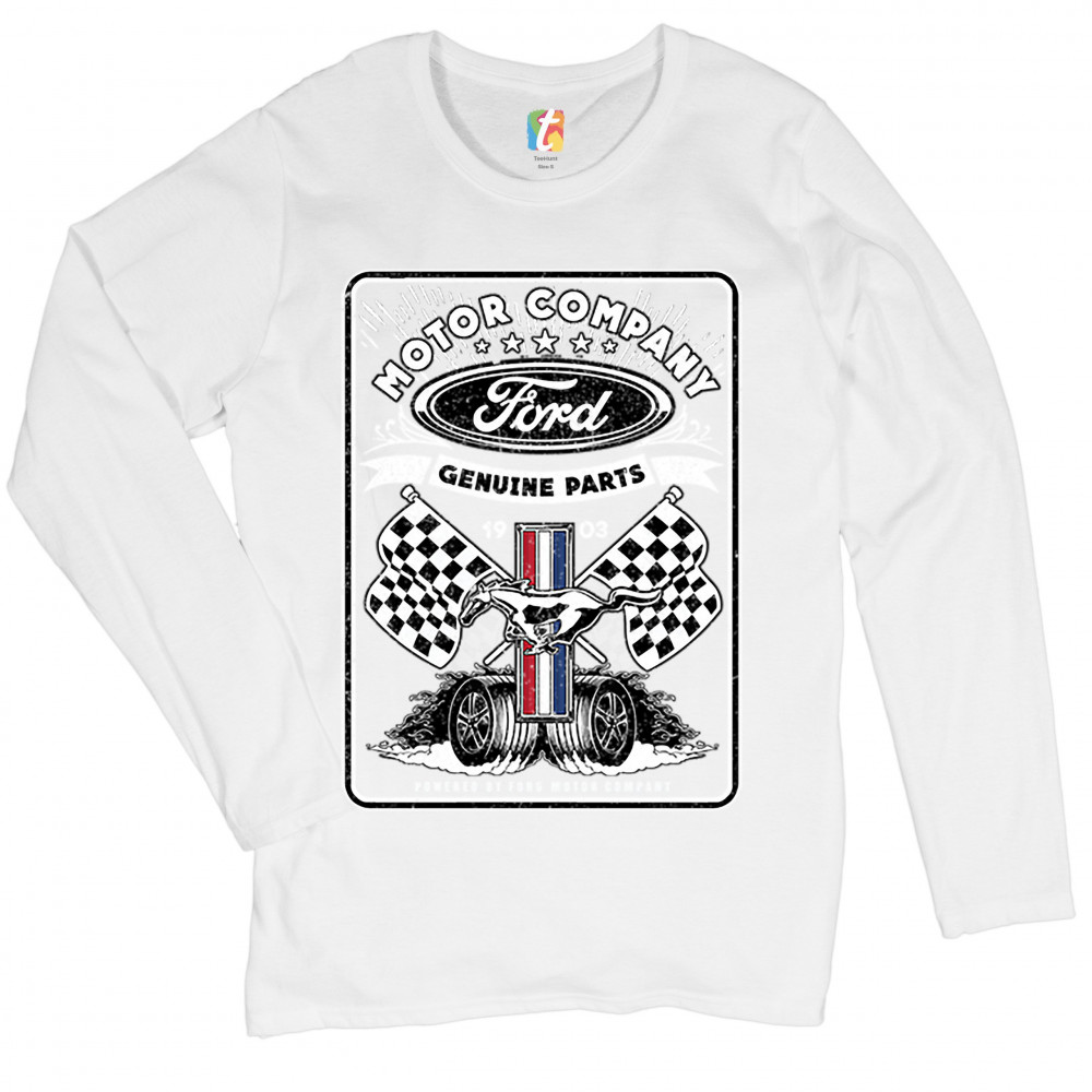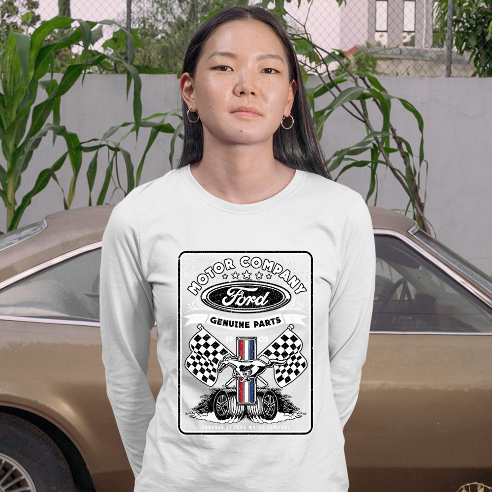 A print featuring Ford logo in the top, Mustang logo in the center, two racing flags and two rolling wheels. The prints says: "Ford Motor Company Genuine Parts 1903" in the top and "Powered by Ford Motor Company" in the bottom. A great choice for anyone w