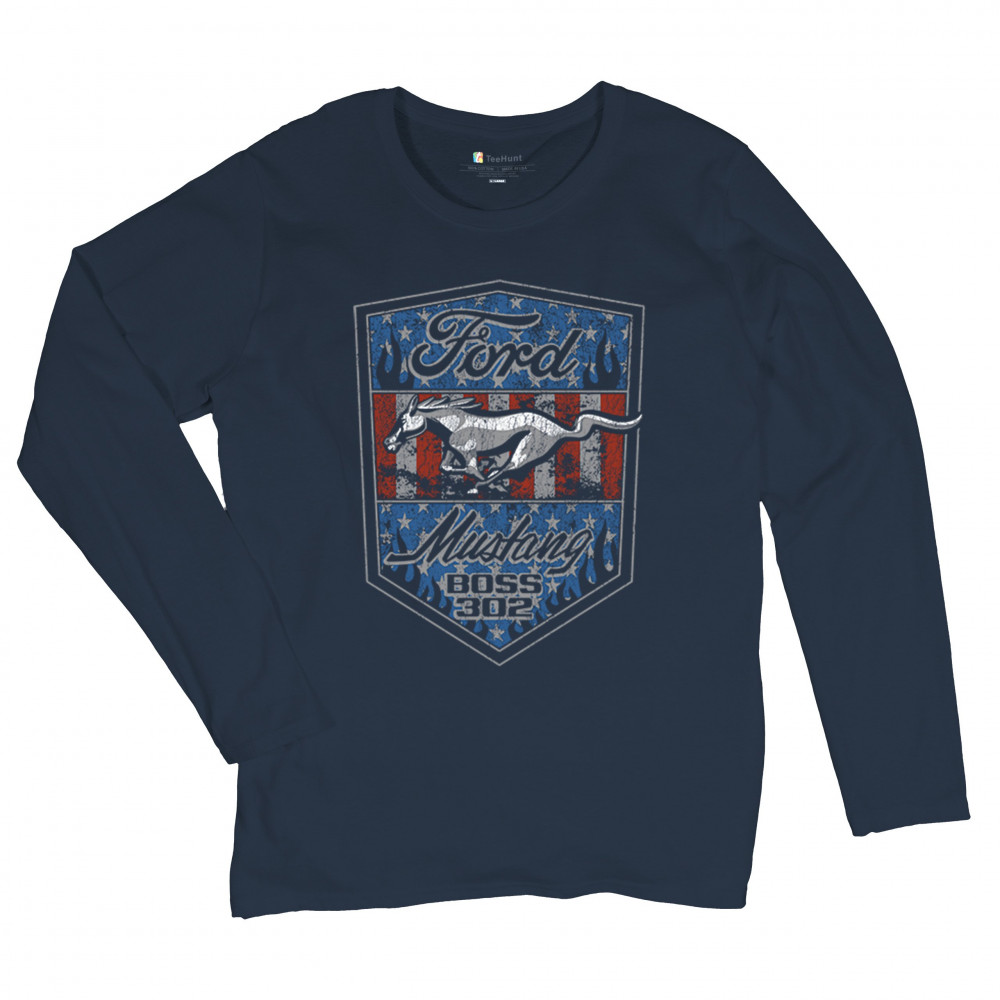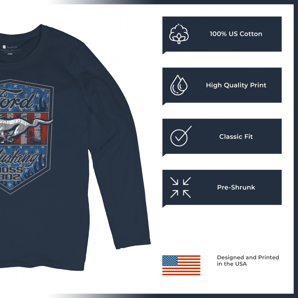 Honor the Ford Mustang Boss 302 legacy with this officially licensed patriotic design, featuring bold flames, the iconic running Mustang, and vintage American muscle style.