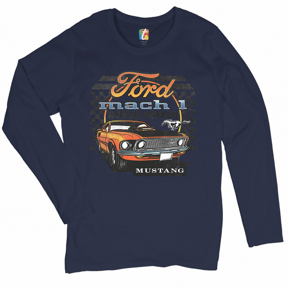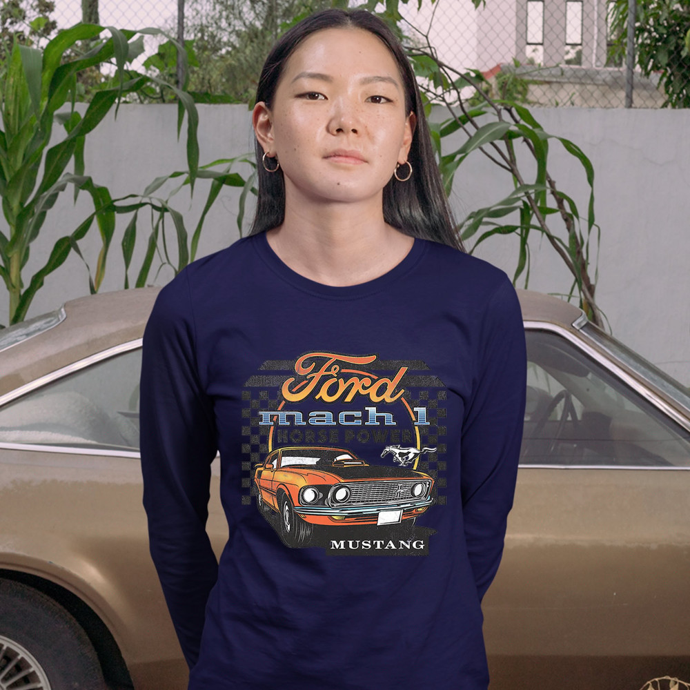 FORD MUSTANG MACH 1 women's long sleeve t-shirt horse power muscle car licensed navy blue