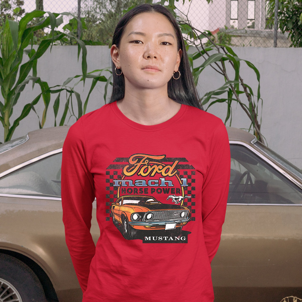 FORD MUSTANG MACH 1 women's long sleeve t-shirt horse power muscle car licensed red