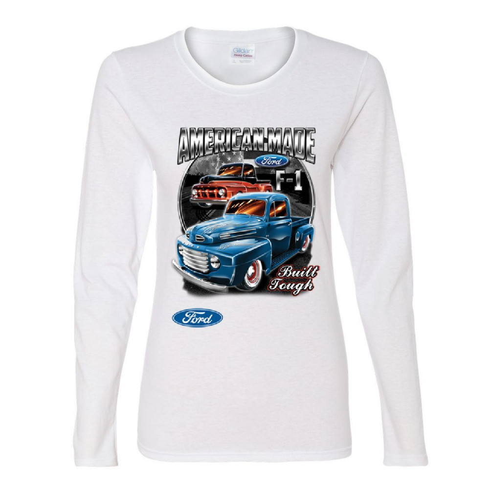FORD PICKUP TRUCKS F1 women's long sleeve tee american made hot rod built tough white