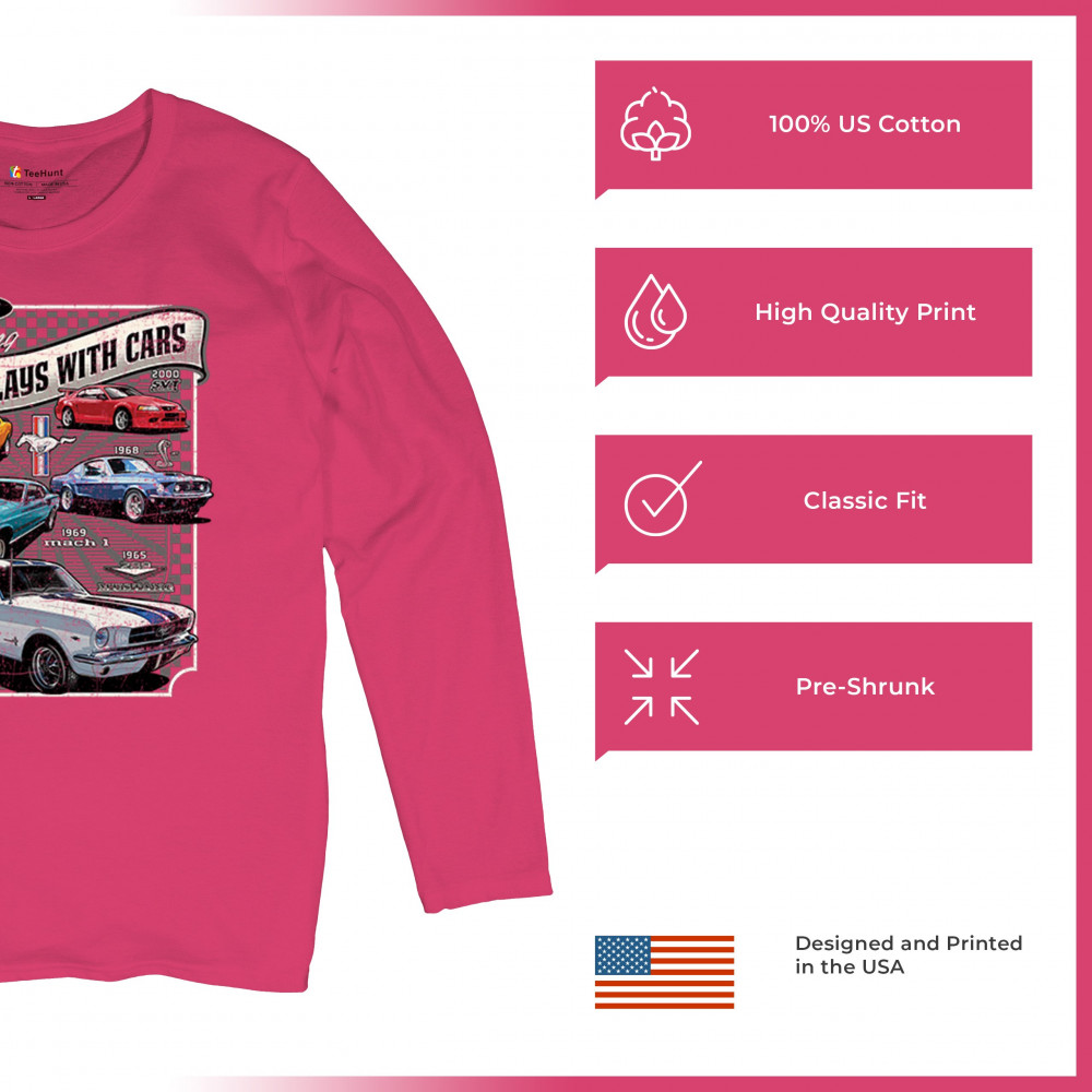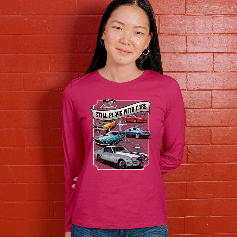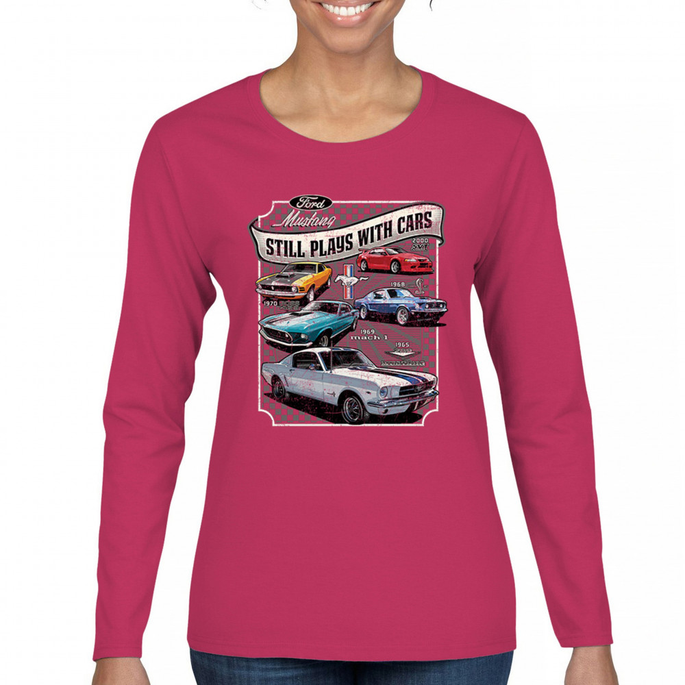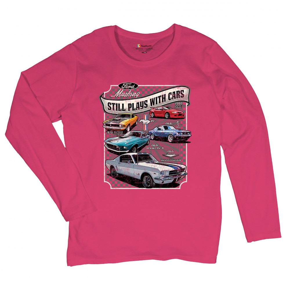 This bold Ford Mustang "Still Plays With Cars" design showcases six classic models from 1965 to 2000, including the 1969 Mach 1, 1970 Boss 302, and 2000 SVT. A dream graphic for muscle car lovers, collectors, and pony car fans. Great for classic auto shows, retro cruises, garage wear, or car clubs.