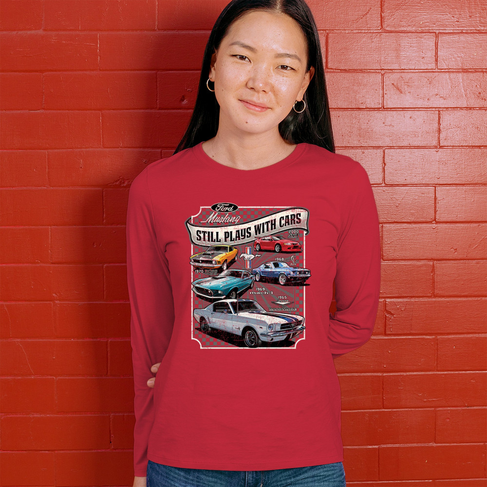 This bold Ford Mustang "Still Plays With Cars" design showcases six classic models from 1965 to 2000, including the 1969 Mach 1, 1970 Boss 302, and 2000 SVT. A dream graphic for muscle car lovers, collectors, and pony car fans. Great for classic auto shows, retro cruises, garage wear, or car clubs.