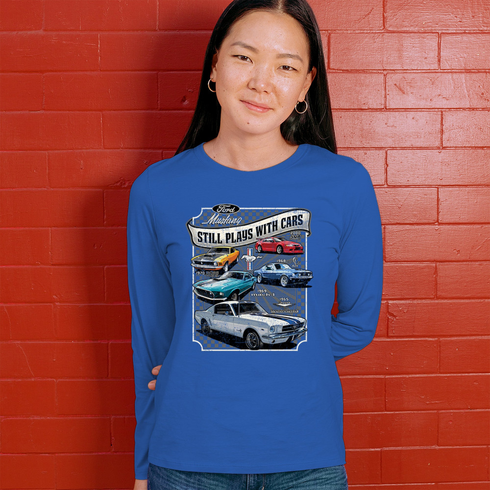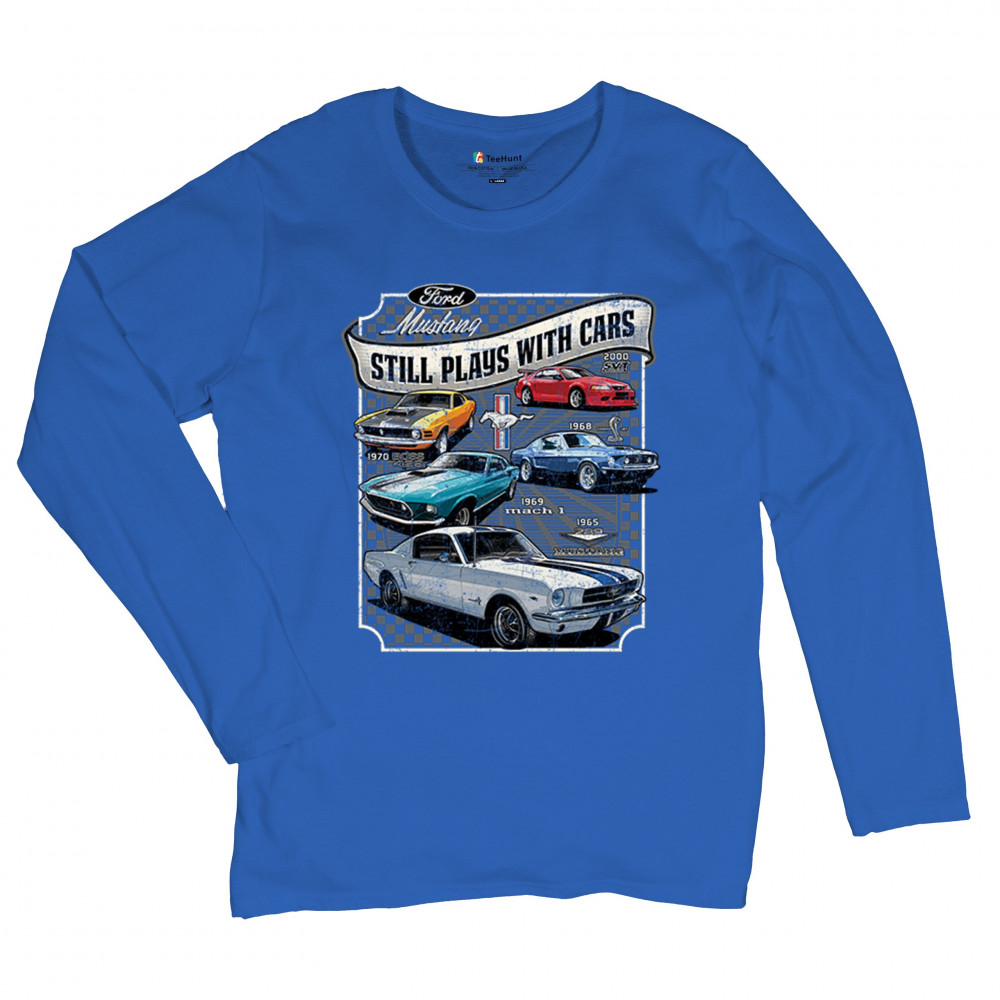 This bold Ford Mustang "Still Plays With Cars" design showcases six classic models from 1965 to 2000, including the 1969 Mach 1, 1970 Boss 302, and 2000 SVT. A dream graphic for muscle car lovers, collectors, and pony car fans. Great for classic auto shows, retro cruises, garage wear, or car clubs.