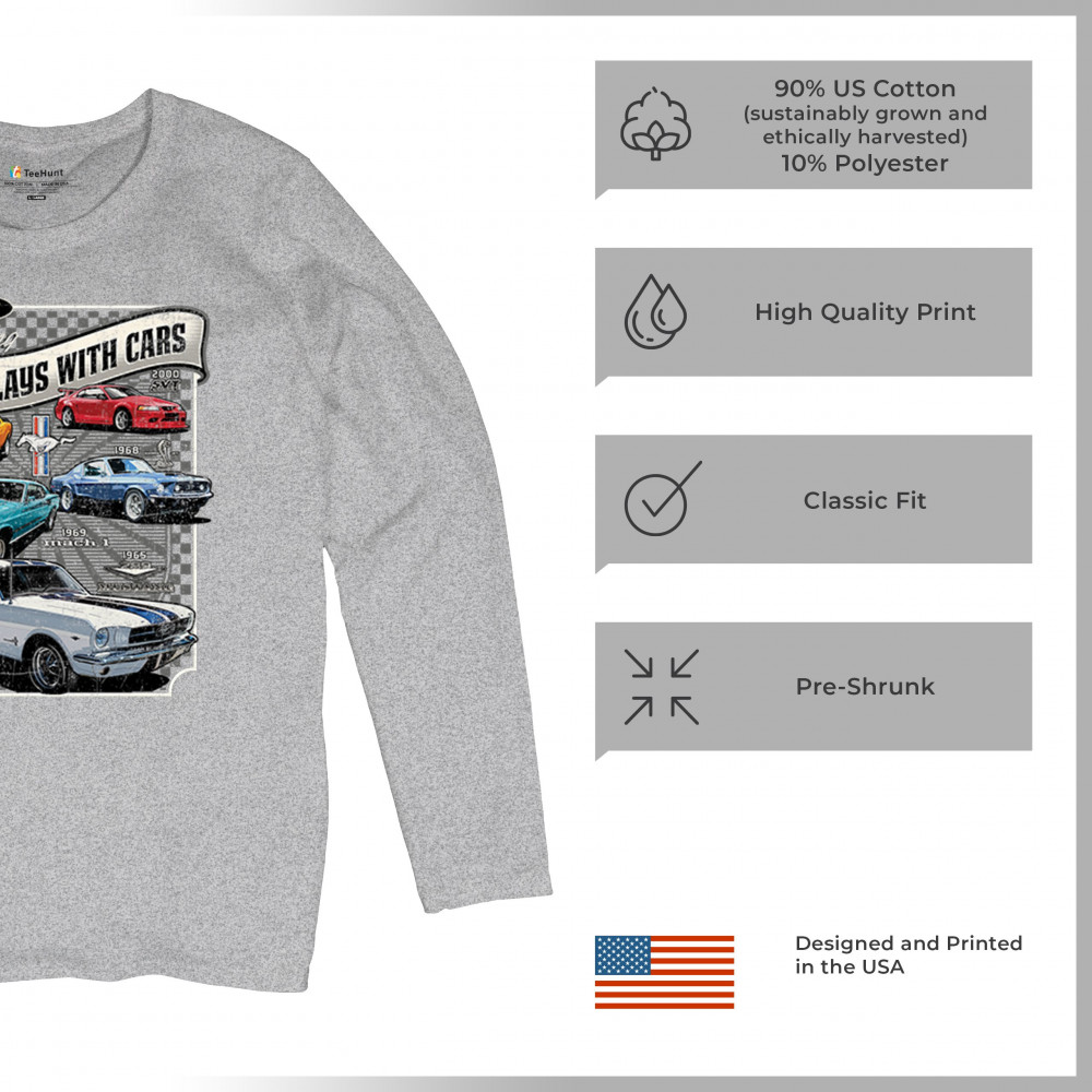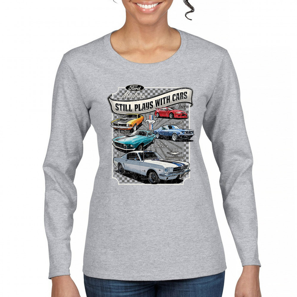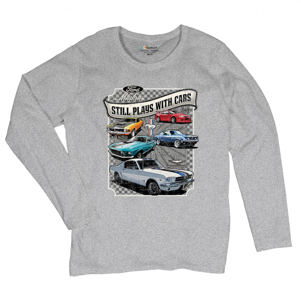 This bold Ford Mustang "Still Plays With Cars" design showcases six classic models from 1965 to 2000, including the 1969 Mach 1, 1970 Boss 302, and 2000 SVT. A dream graphic for muscle car lovers, collectors, and pony car fans. Great for classic auto shows, retro cruises, garage wear, or car clubs.