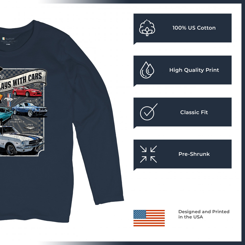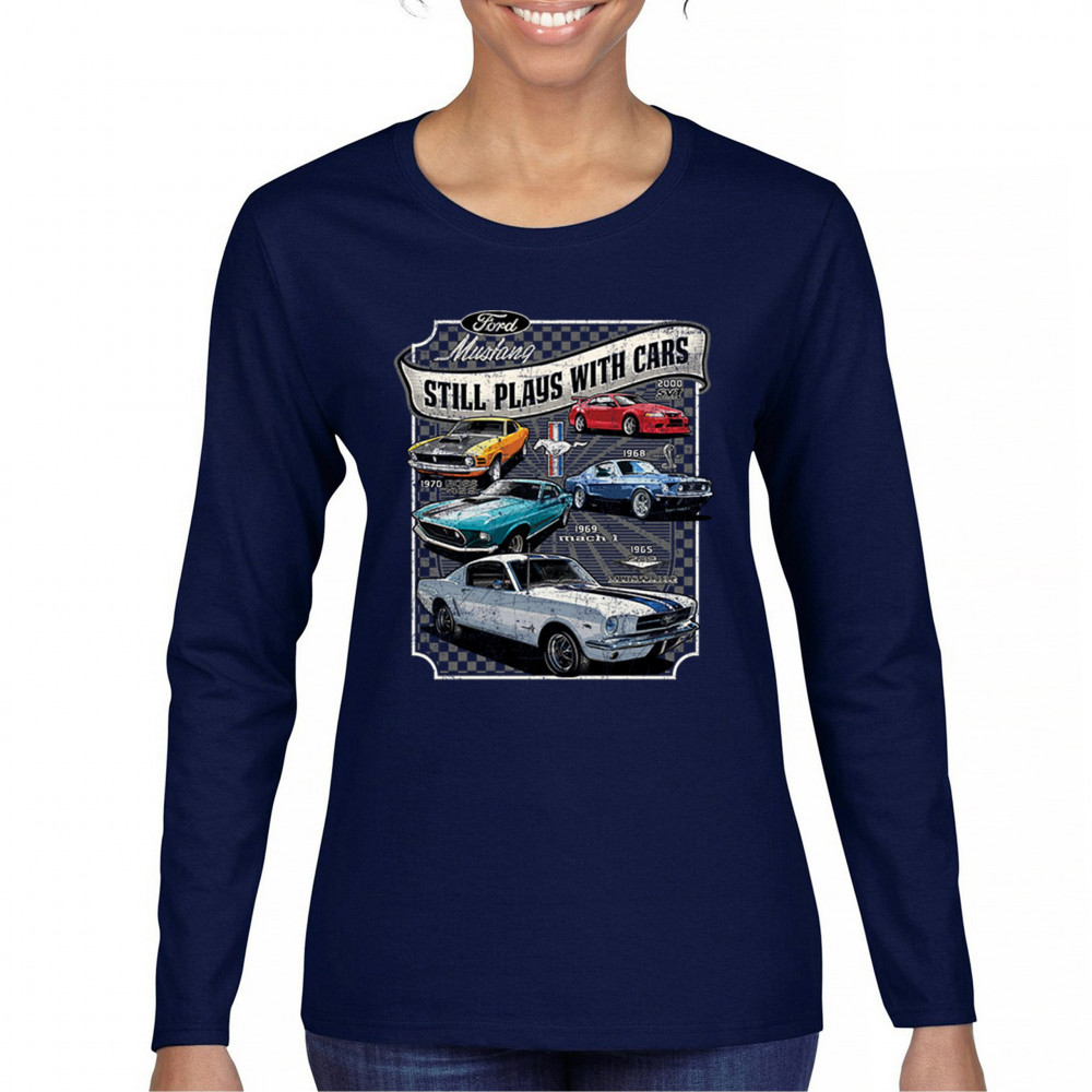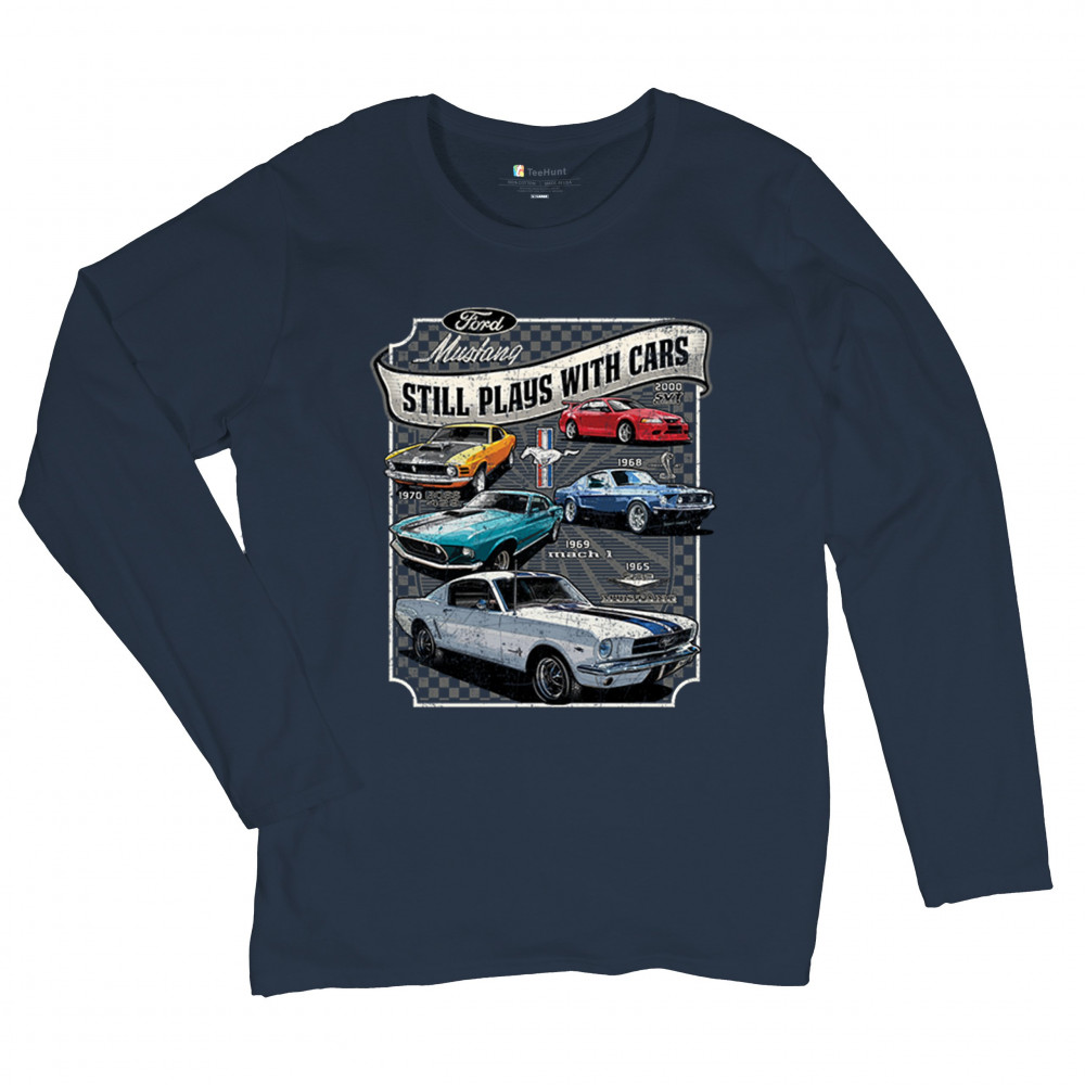 This bold Ford Mustang "Still Plays With Cars" design showcases six classic models from 1965 to 2000, including the 1969 Mach 1, 1970 Boss 302, and 2000 SVT. A dream graphic for muscle car lovers, collectors, and pony car fans. Great for classic auto shows, retro cruises, garage wear, or car clubs.