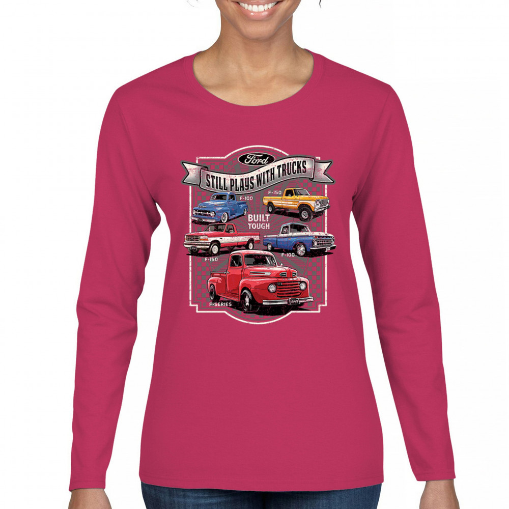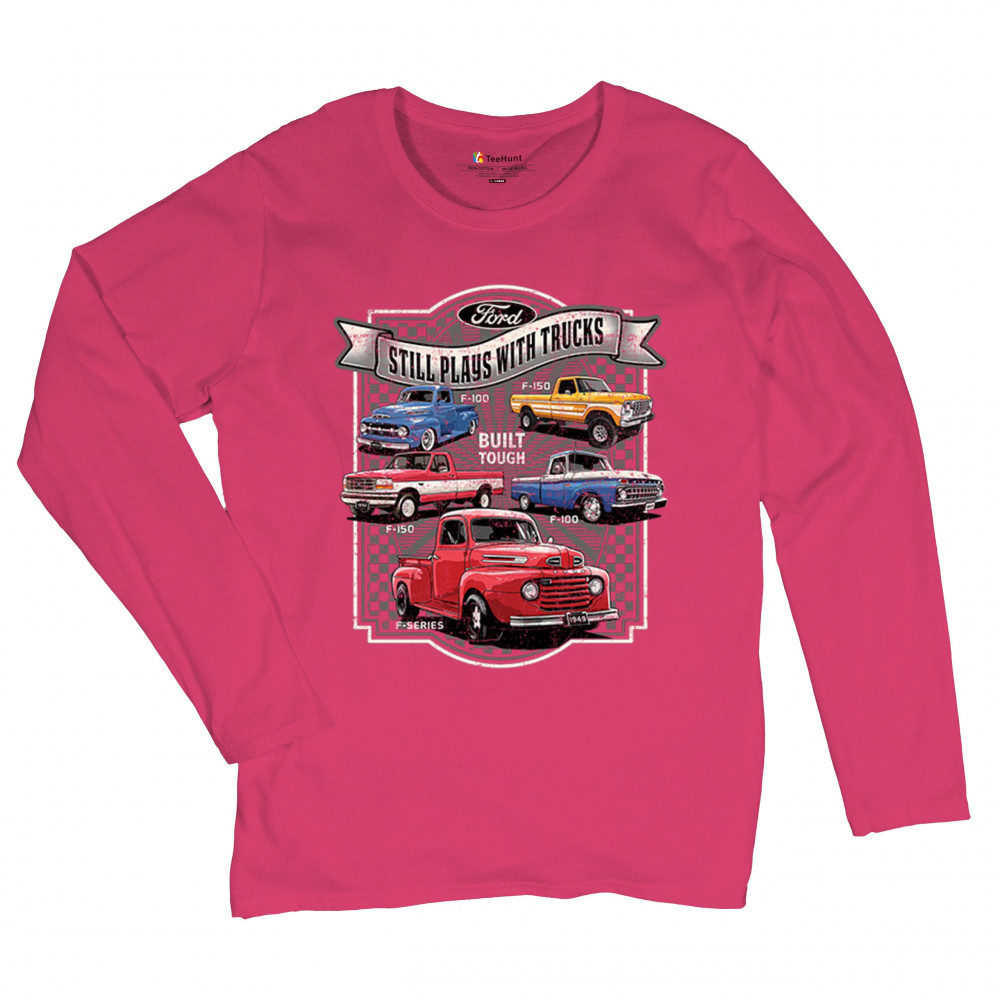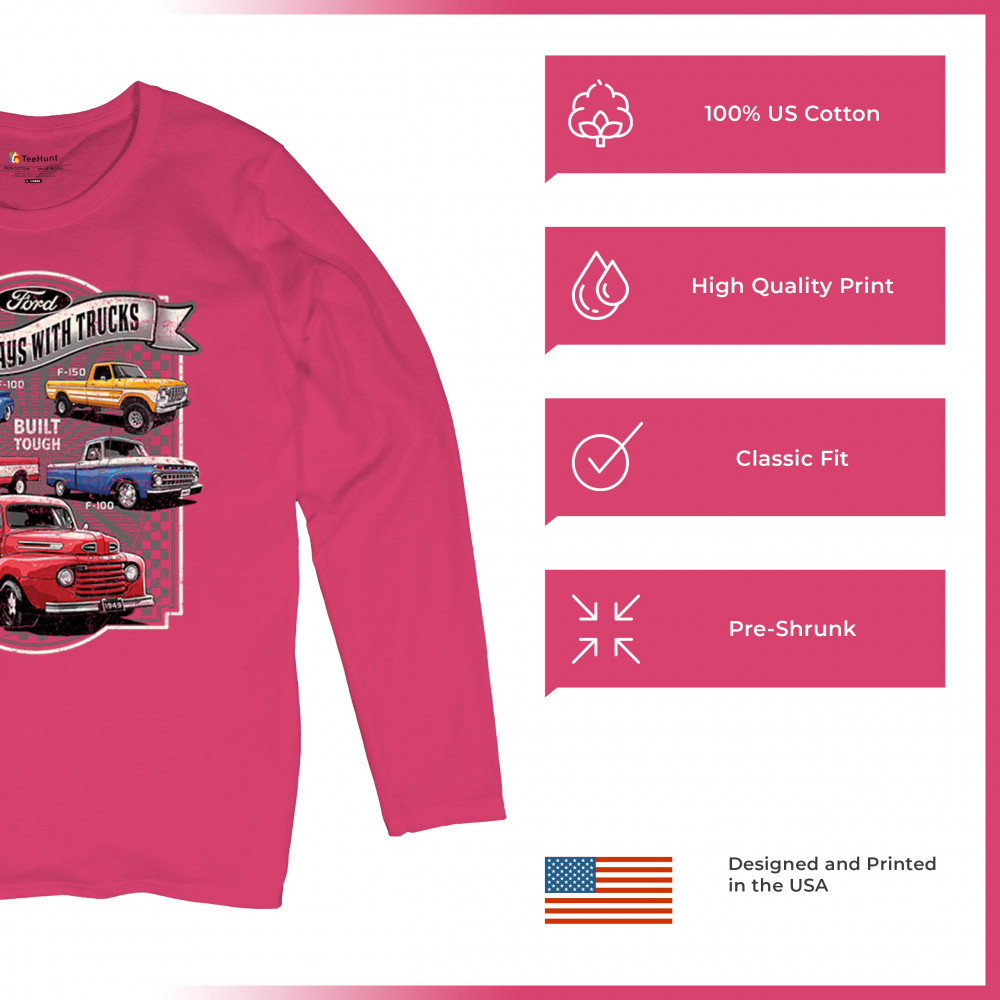 Features classic Ford F-Series trucks from 1949 to F-150. Great for vintage truck fans, garage wear, car shows, and collectors who love pickups.