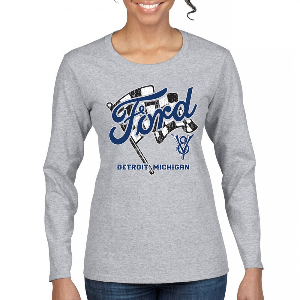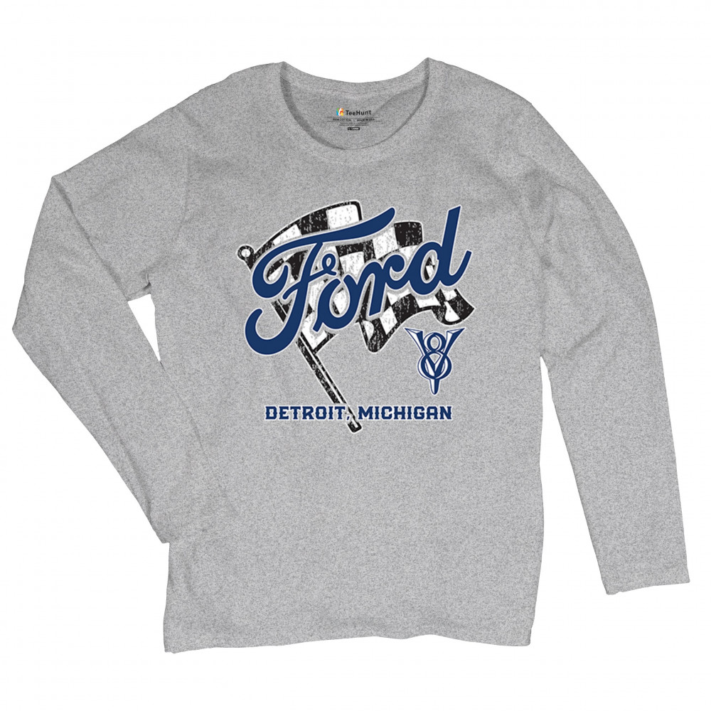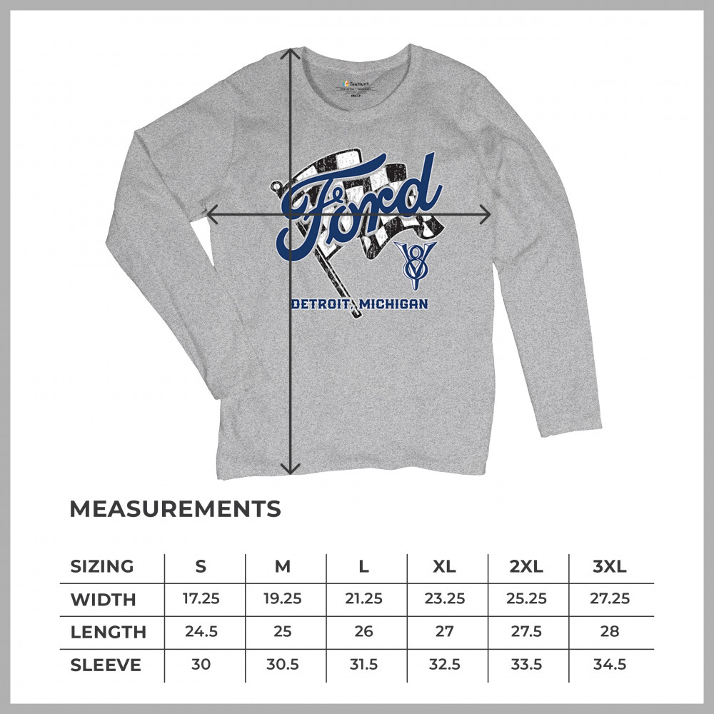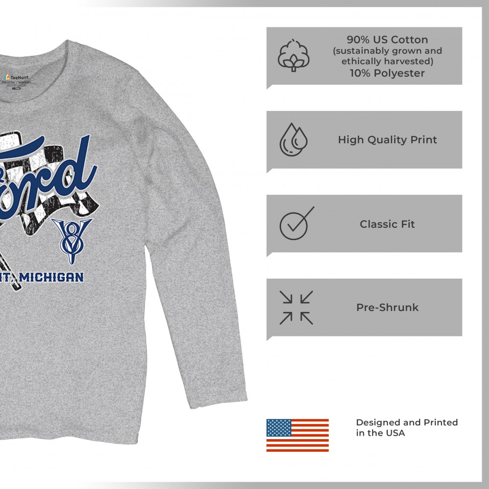 Honor Detroit, Michigan’s Ford legacy with this officially licensed design featuring a checkered flag and bold V8 emblem, perfect for muscle car fans and classic car lovers.