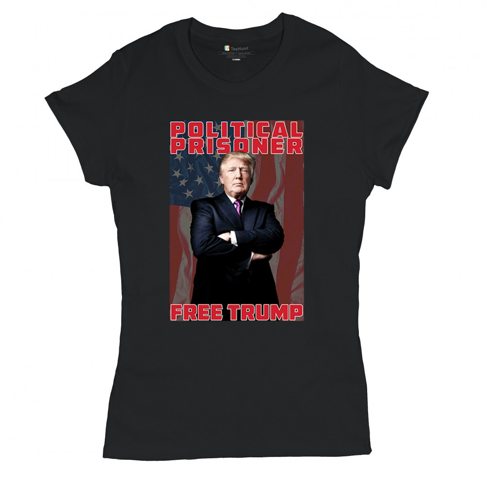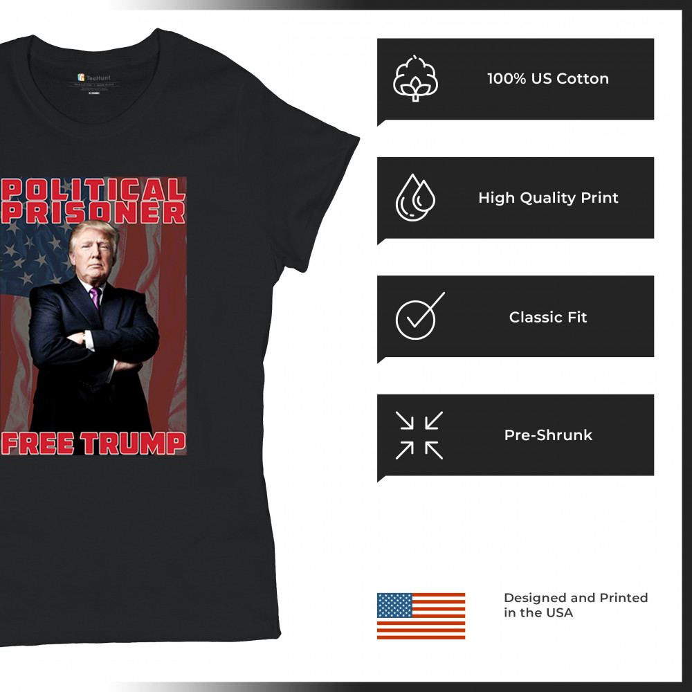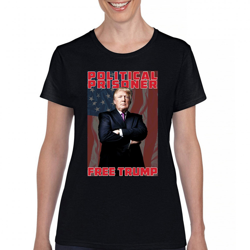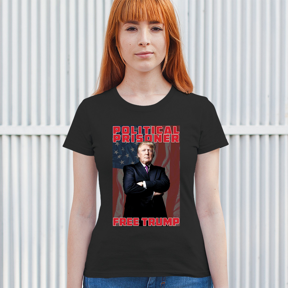 Show your support with the "Political Prisoner Free Trump" design, featuring Trump against an American flag. Perfect for conservative patriots and Trump supporters.