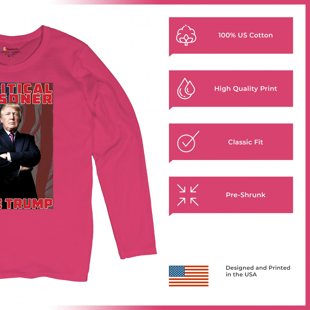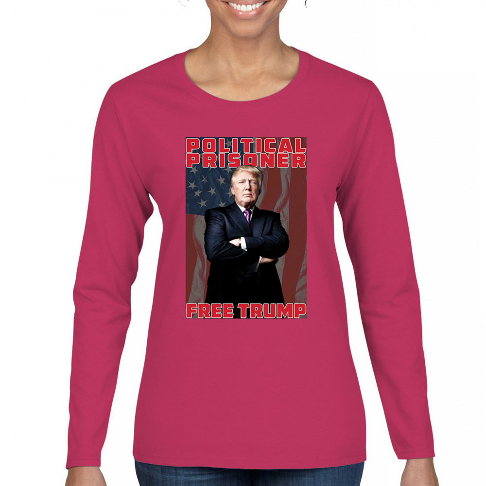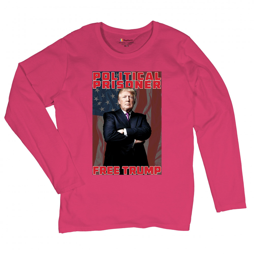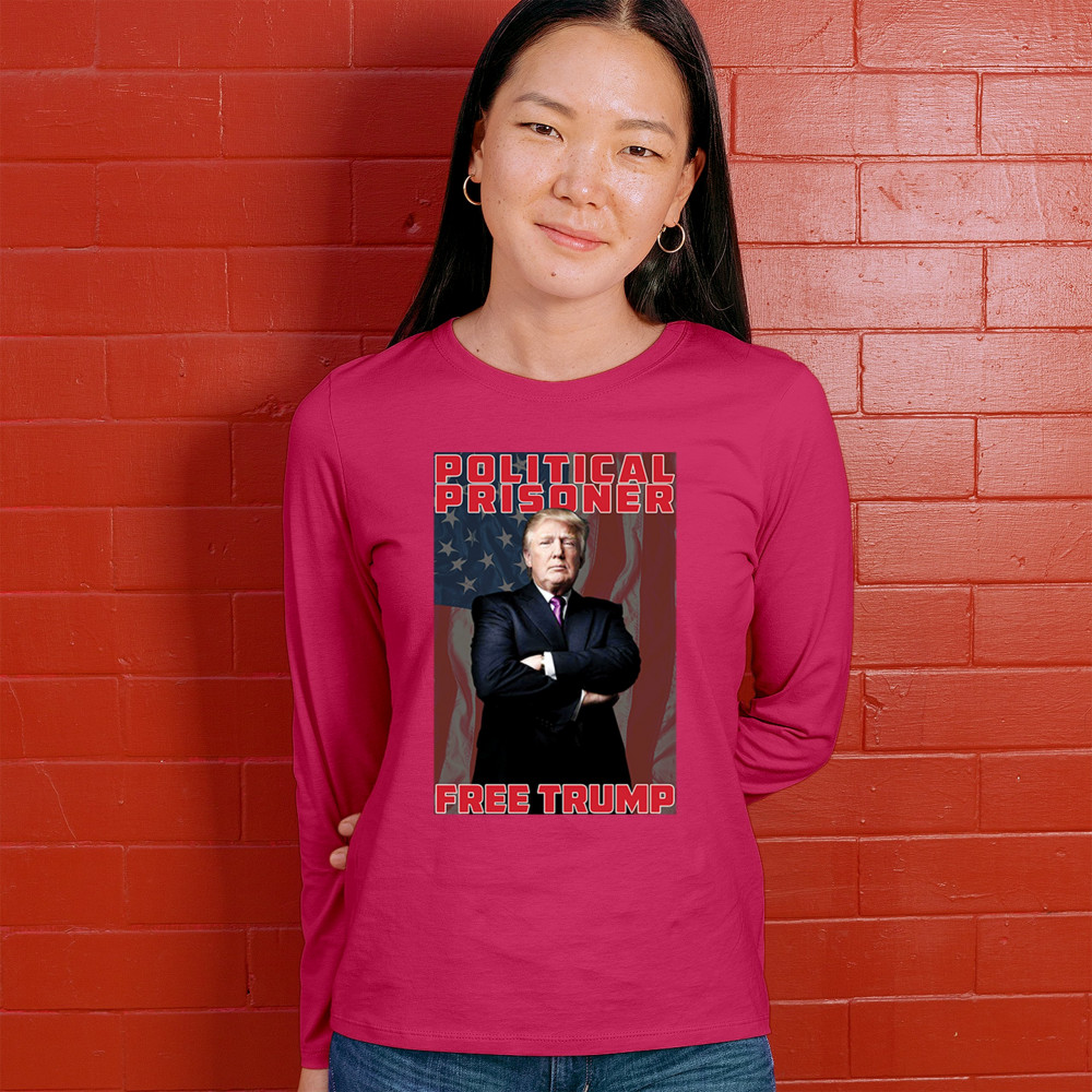 Show your support with the "Political Prisoner Free Trump" design, featuring Trump against an American flag. Perfect for conservative patriots and Trump supporters.