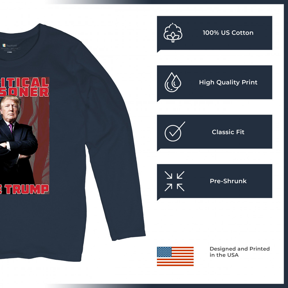 Show your support with the "Political Prisoner Free Trump" design, featuring Trump against an American flag. Perfect for conservative patriots and Trump supporters.