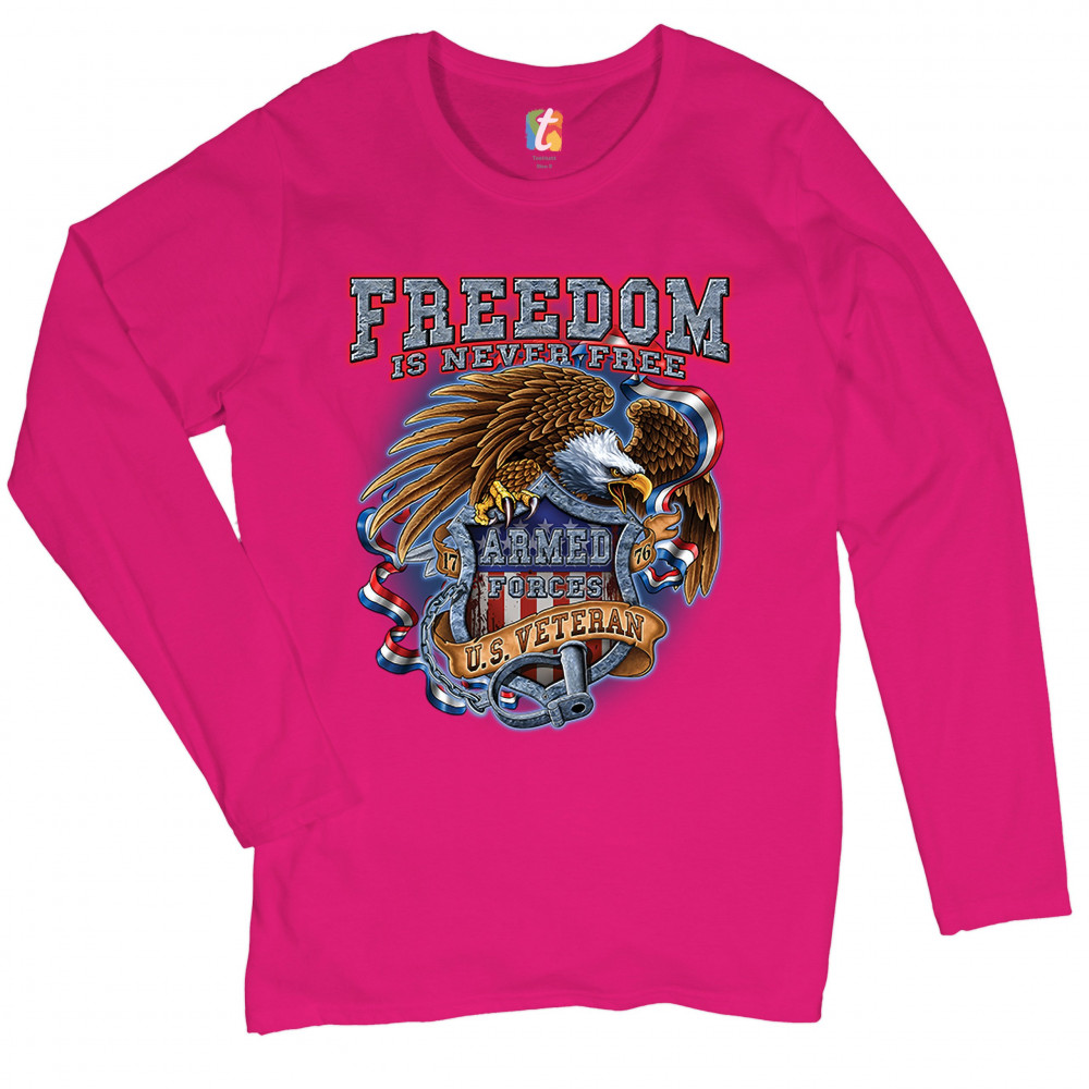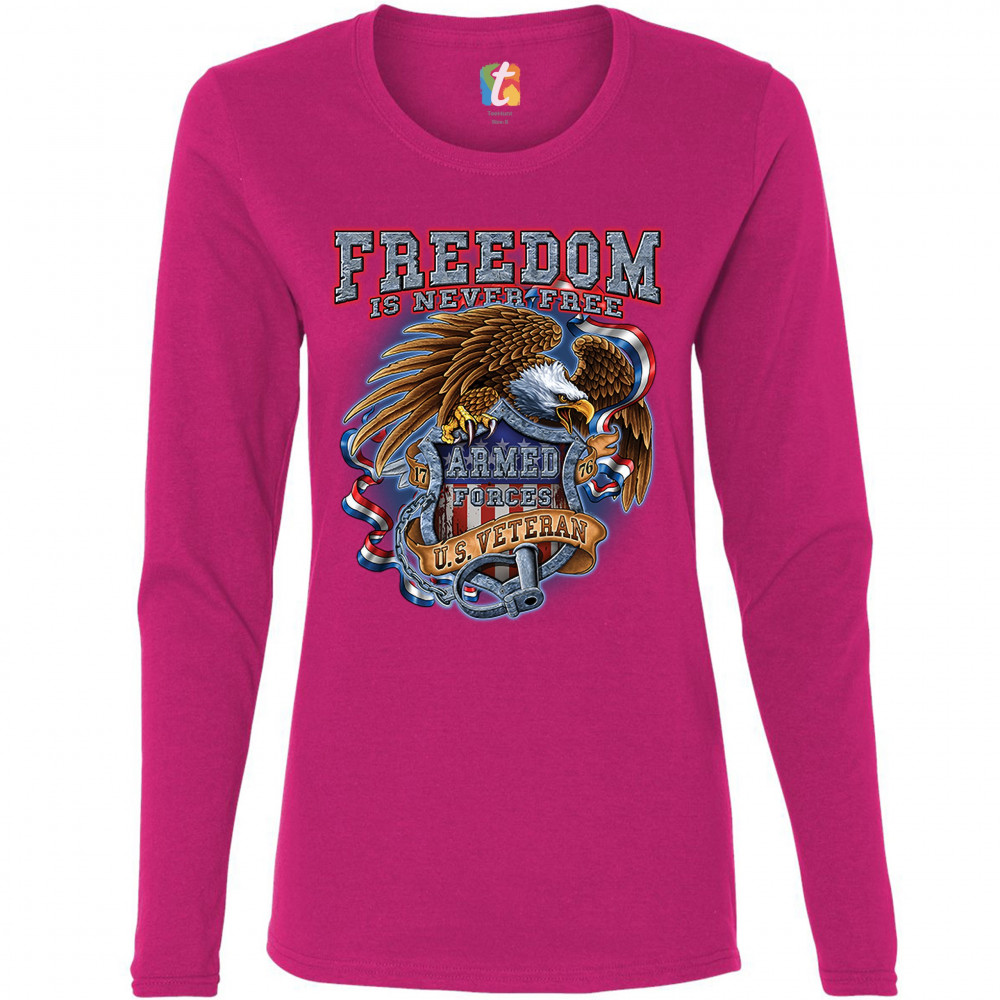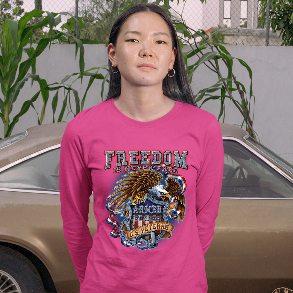 A patriotic print featuring a bald eagle holding a shield with an American Flag and "Armed Forces" written on it. The print says: "Freedom Is Never Free, 1776, U.S. Veteran". Great choice to wear on Independence Day or any other patriotic holiday.