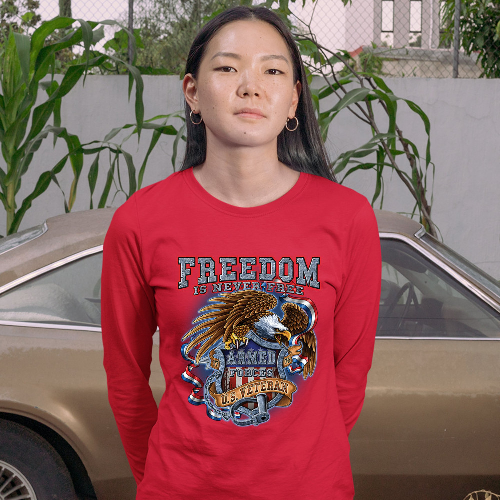 A patriotic print featuring a bald eagle holding a shield with an American Flag and "Armed Forces" written on it. The print says: "Freedom Is Never Free, 1776, U.S. Veteran". Great choice to wear on Independence Day or any other patriotic holiday.