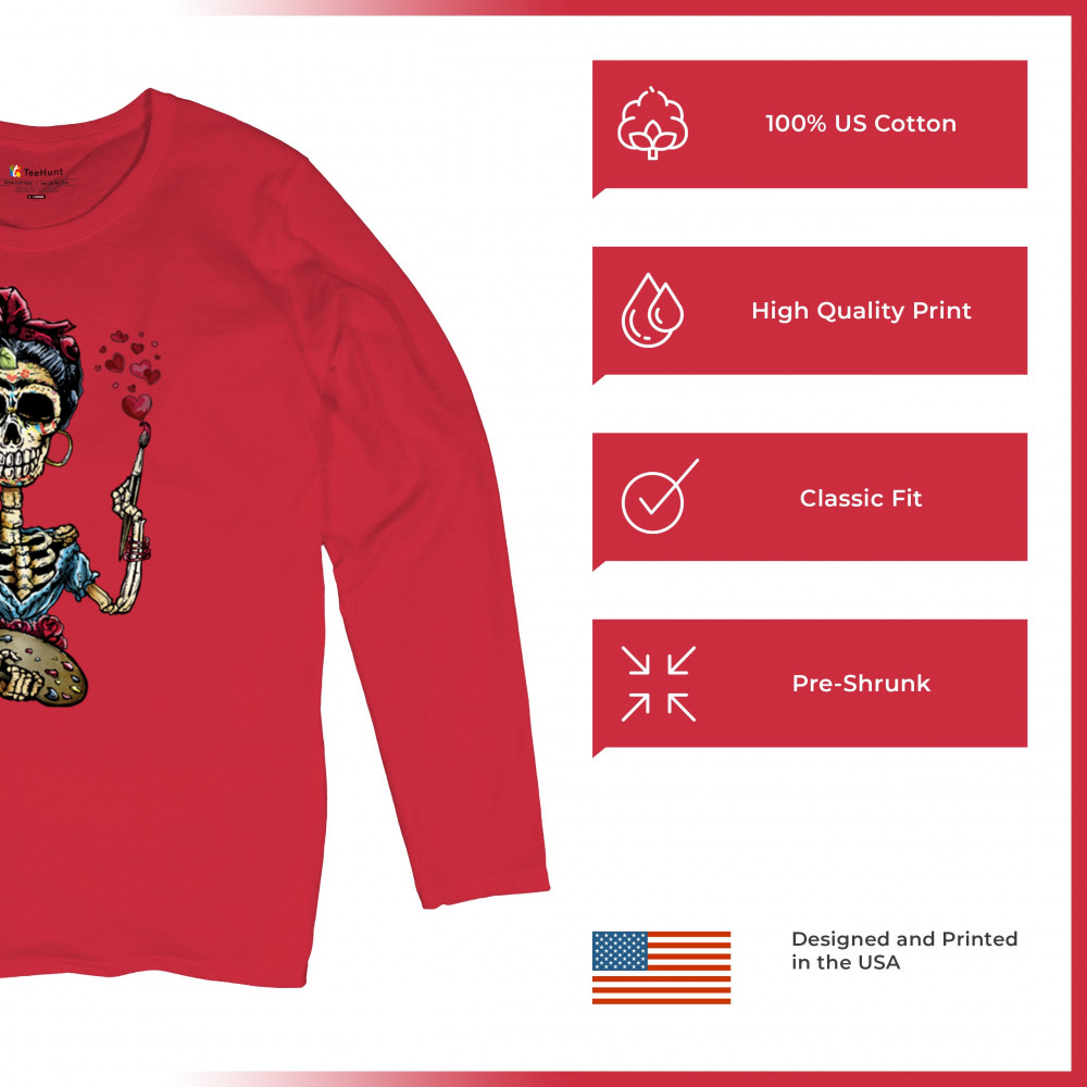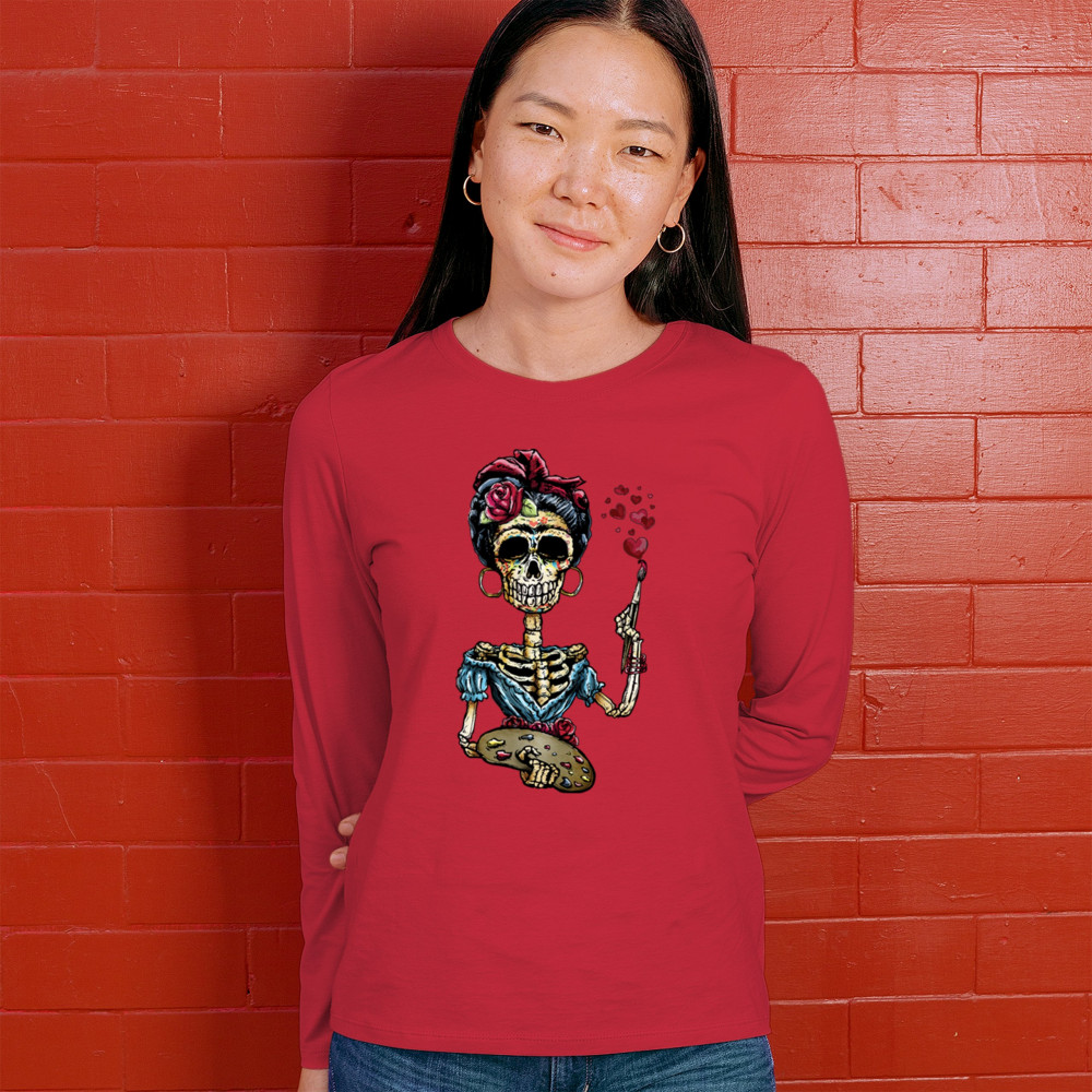 FRIDA KAHLO SUGAR SKULL women's long sleeve t-shirt calavera day of the dead red