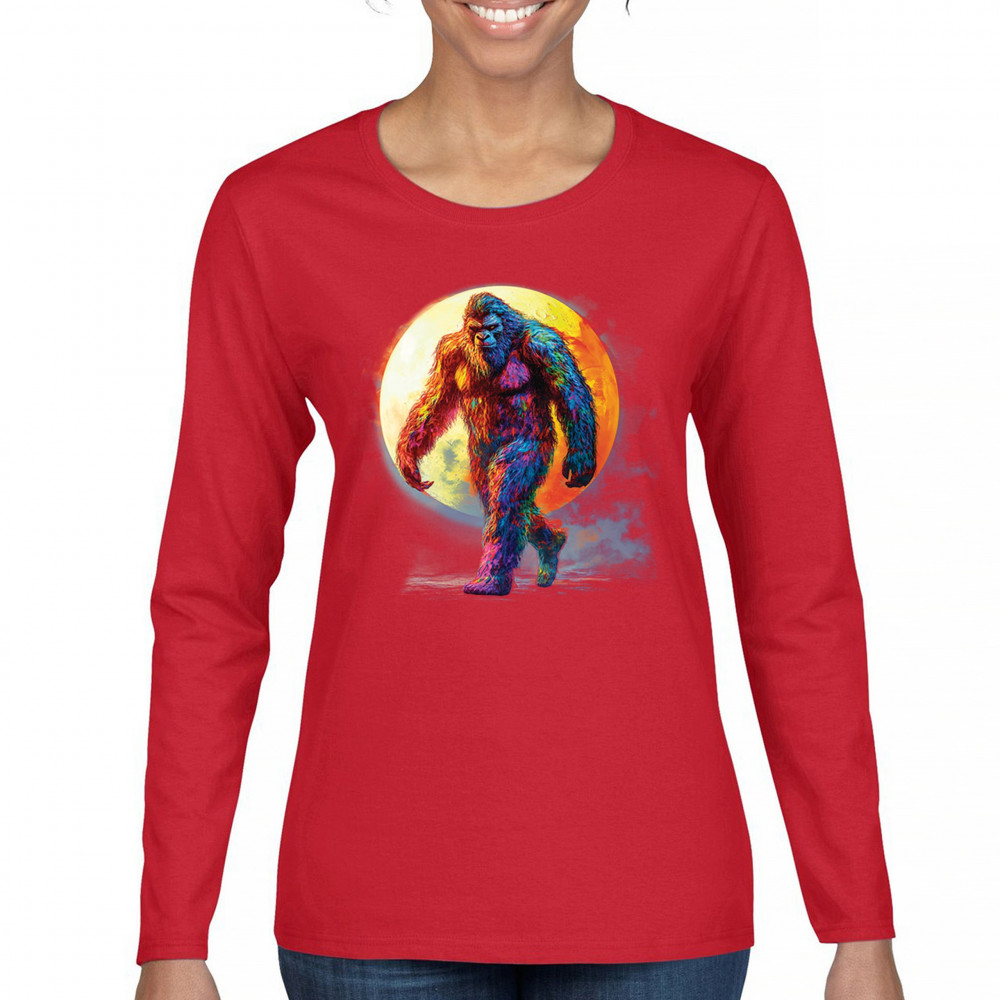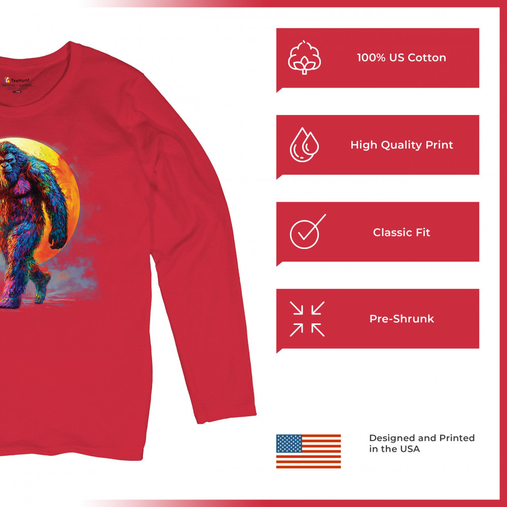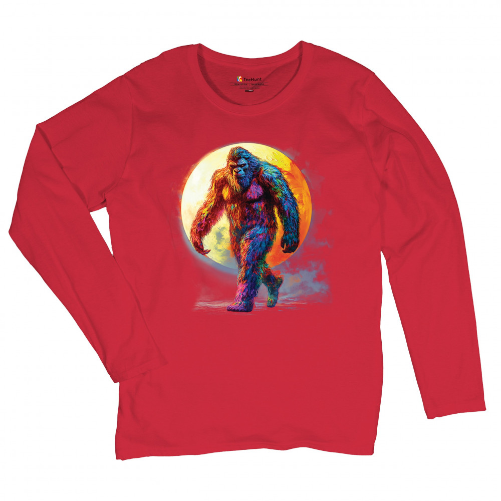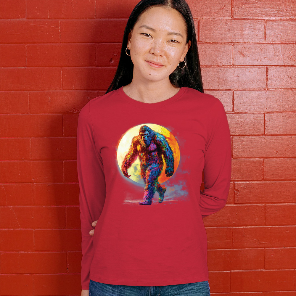 Rainbow Bigfoot under full moon design for cryptid lovers, festival goers, and psychedelic art fans. Bold, surreal, and eye-catching.