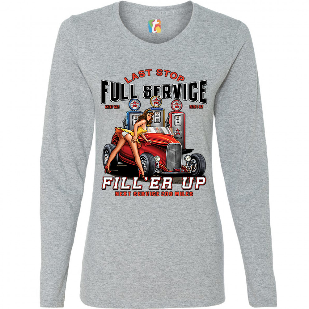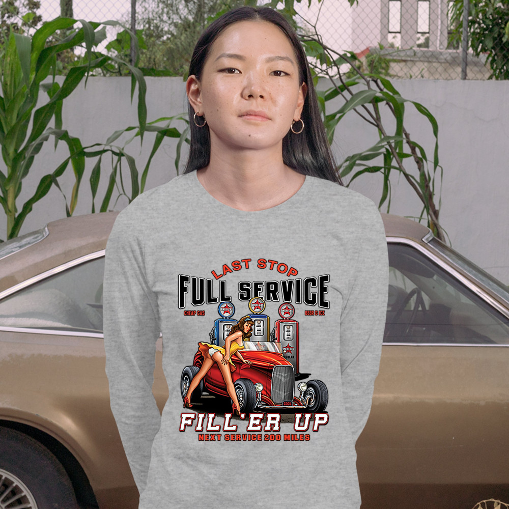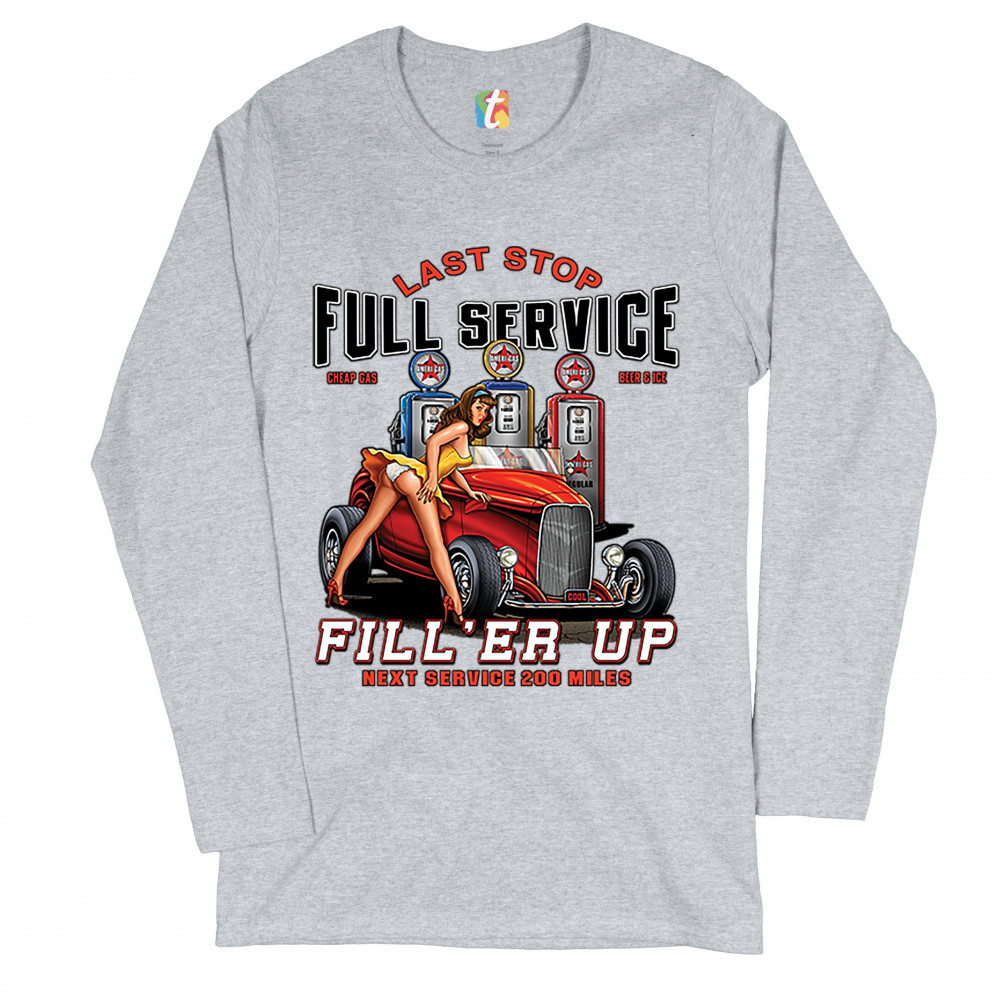 A print featuring a hot pin-up girl leaning on a convertible coupe hot rod with a registration plate saying "cool". In the background there are several gas stations. The print says: "Last Stop, Full Service, Cheap Gas, Beer & Ice, Fill 'Er Up, Next Servic