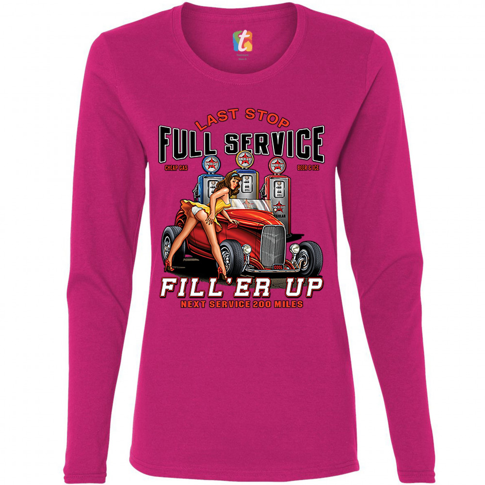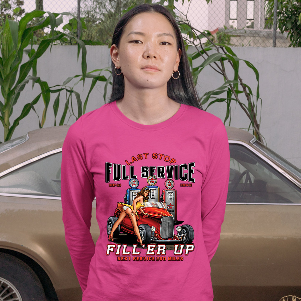 A print featuring a hot pin-up girl leaning on a convertible coupe hot rod with a registration plate saying "cool". In the background there are several gas stations. The print says: "Last Stop, Full Service, Cheap Gas, Beer & Ice, Fill 'Er Up, Next Servic