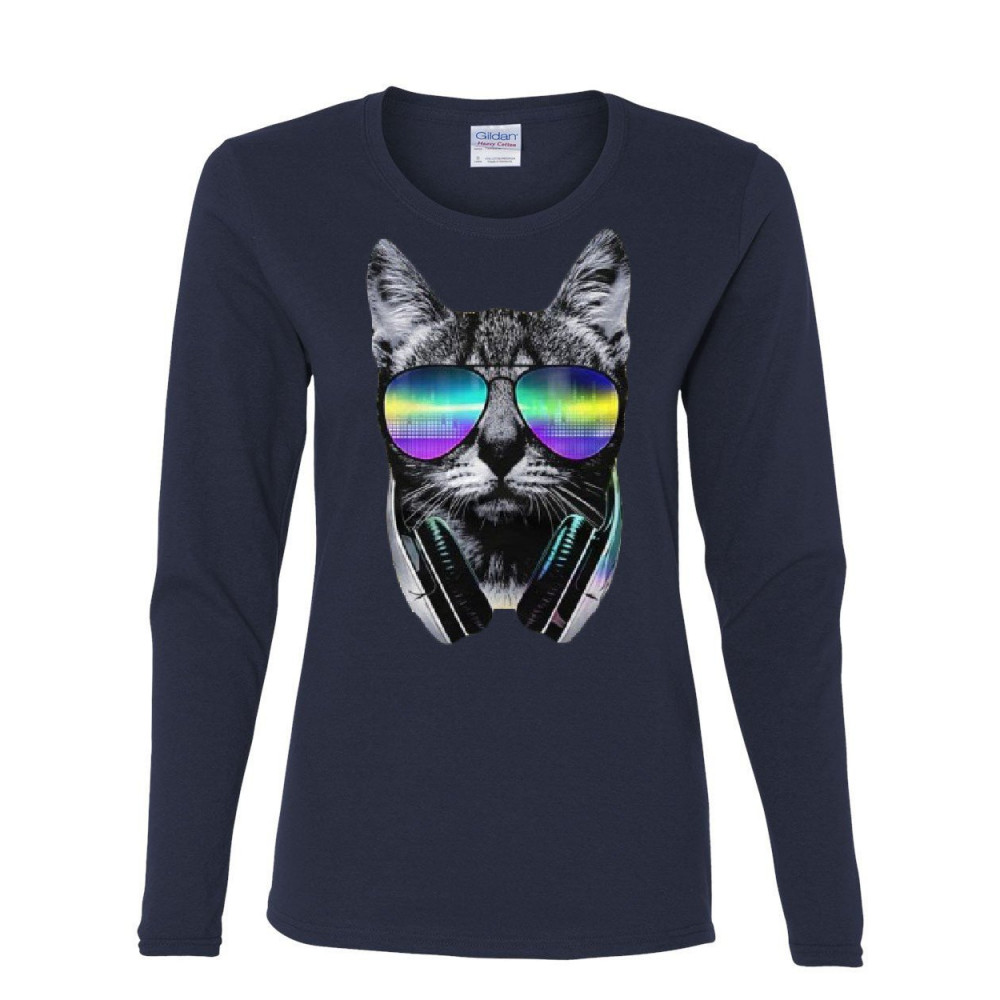 FUNNY DJ CAT long sleeve t-shirt music kitten headphones and glasses navy blue