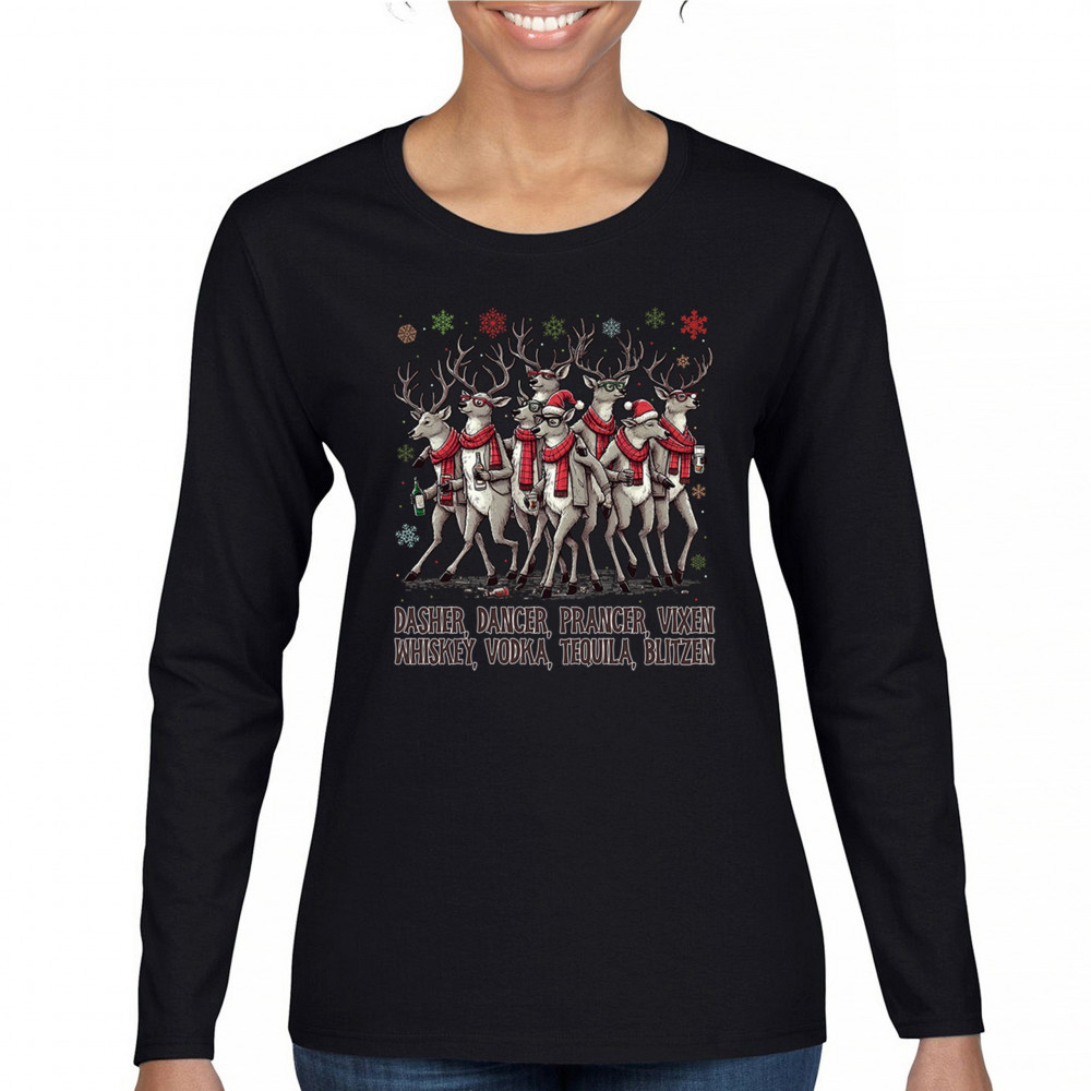 This funny holiday design features a squad of drinking reindeer carrying bottles and dressed in scarves for the ultimate Christmas party vibe. Great for bar crawls, office parties, winter gatherings, adult holiday events, white elephant exchanges, festive nights out, and anyone who loves spirited Christmas humor with a cheeky personality.