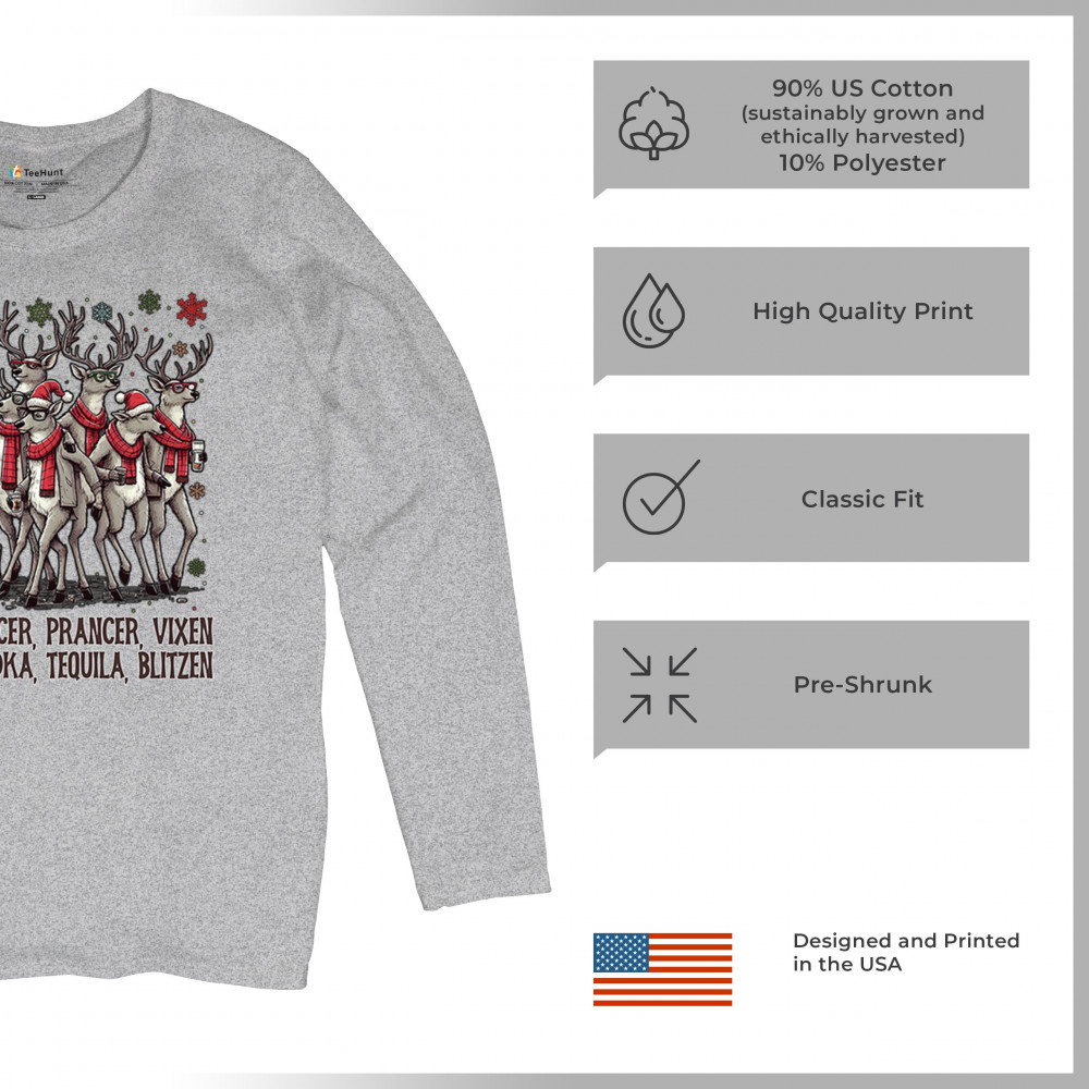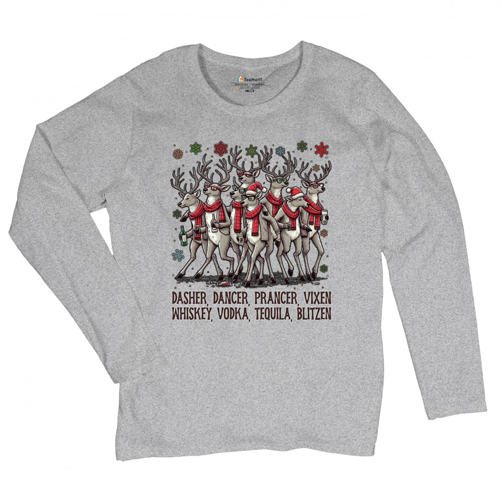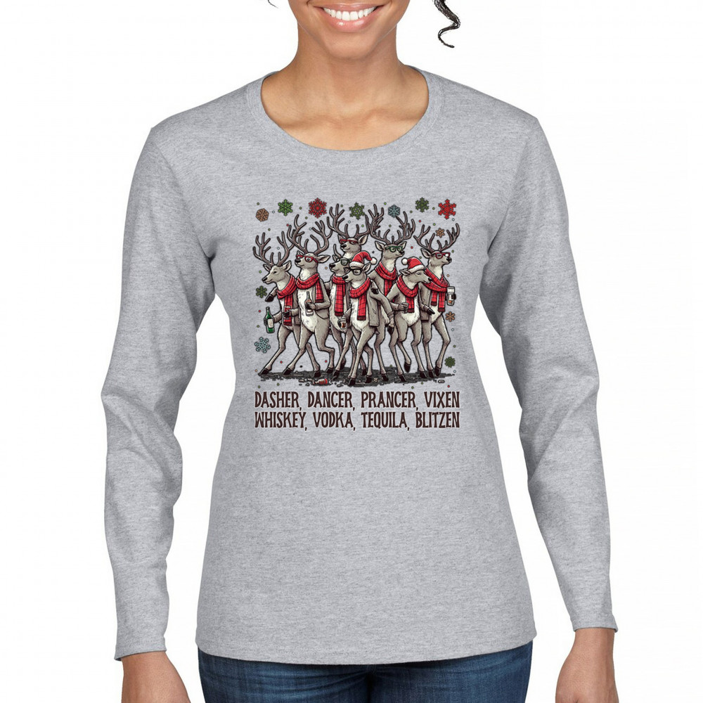 This funny holiday design features a squad of drinking reindeer carrying bottles and dressed in scarves for the ultimate Christmas party vibe. Great for bar crawls, office parties, winter gatherings, adult holiday events, white elephant exchanges, festive nights out, and anyone who loves spirited Christmas humor with a cheeky personality.