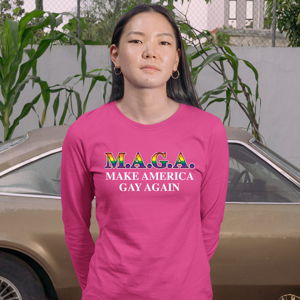 A funny print saying "M.A.G.A. Make America Gay Again". The acronym "M.A.G.A." is painted in the colors of lgbt rainbow. Wear it to show your support for the LGBTQ community.