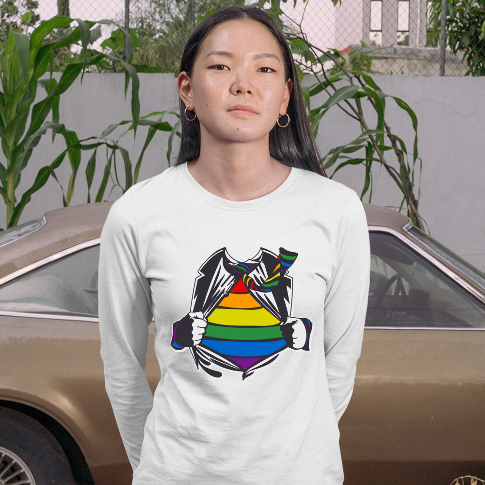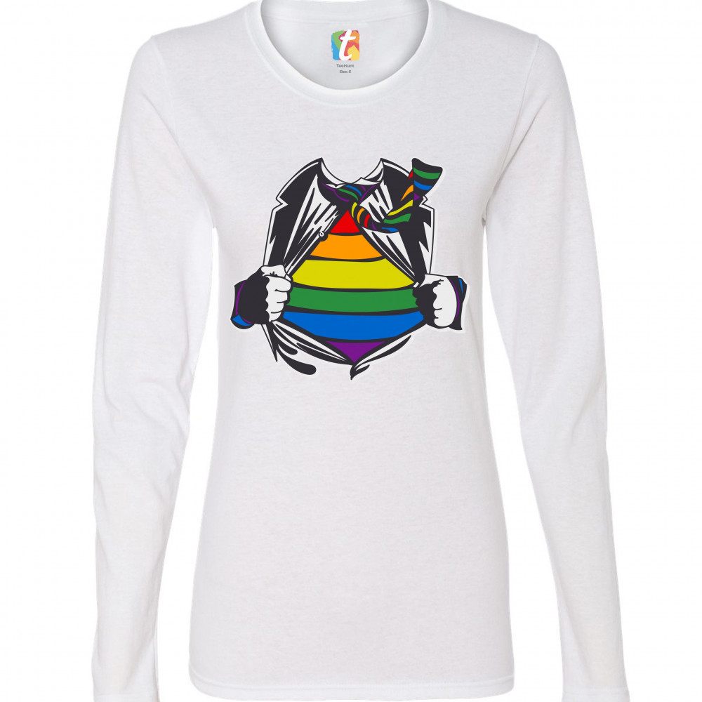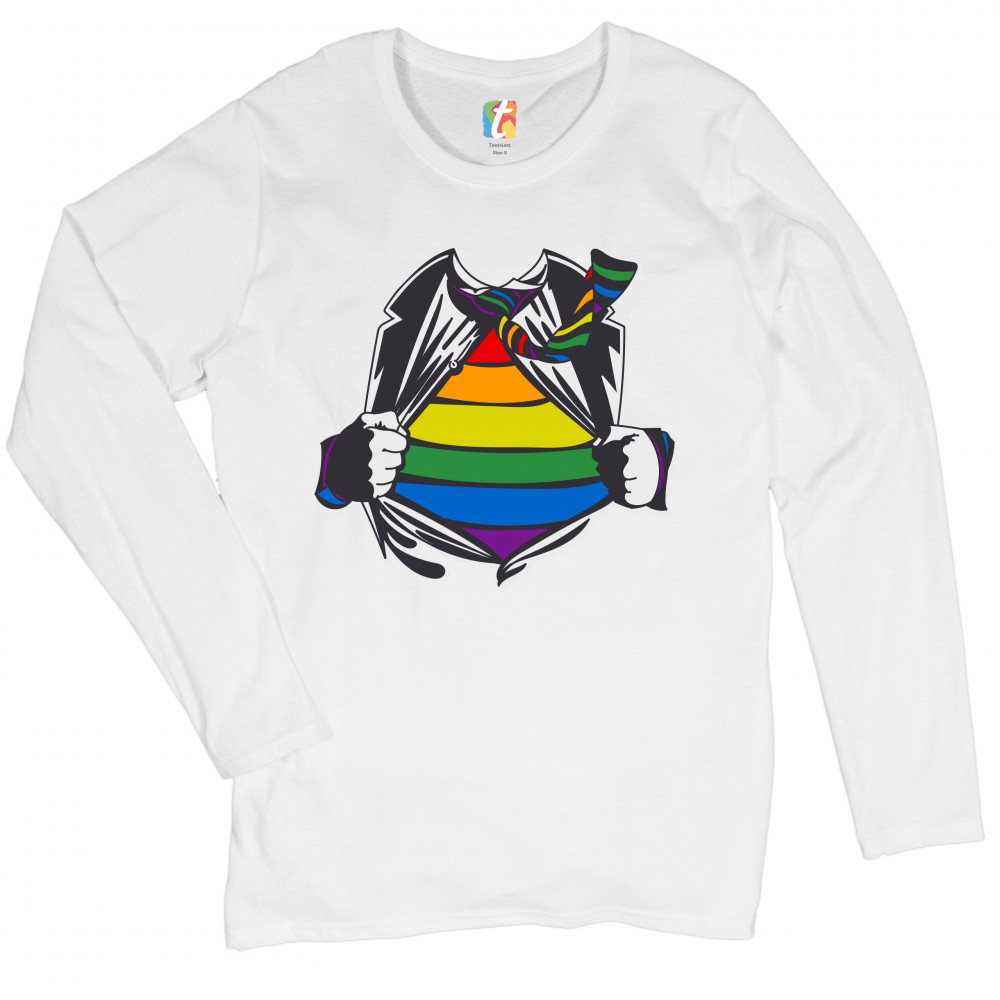 GAY SUPERHERO PARODY women's long sleeve t-shirt lesbian bi transgender rainbow white