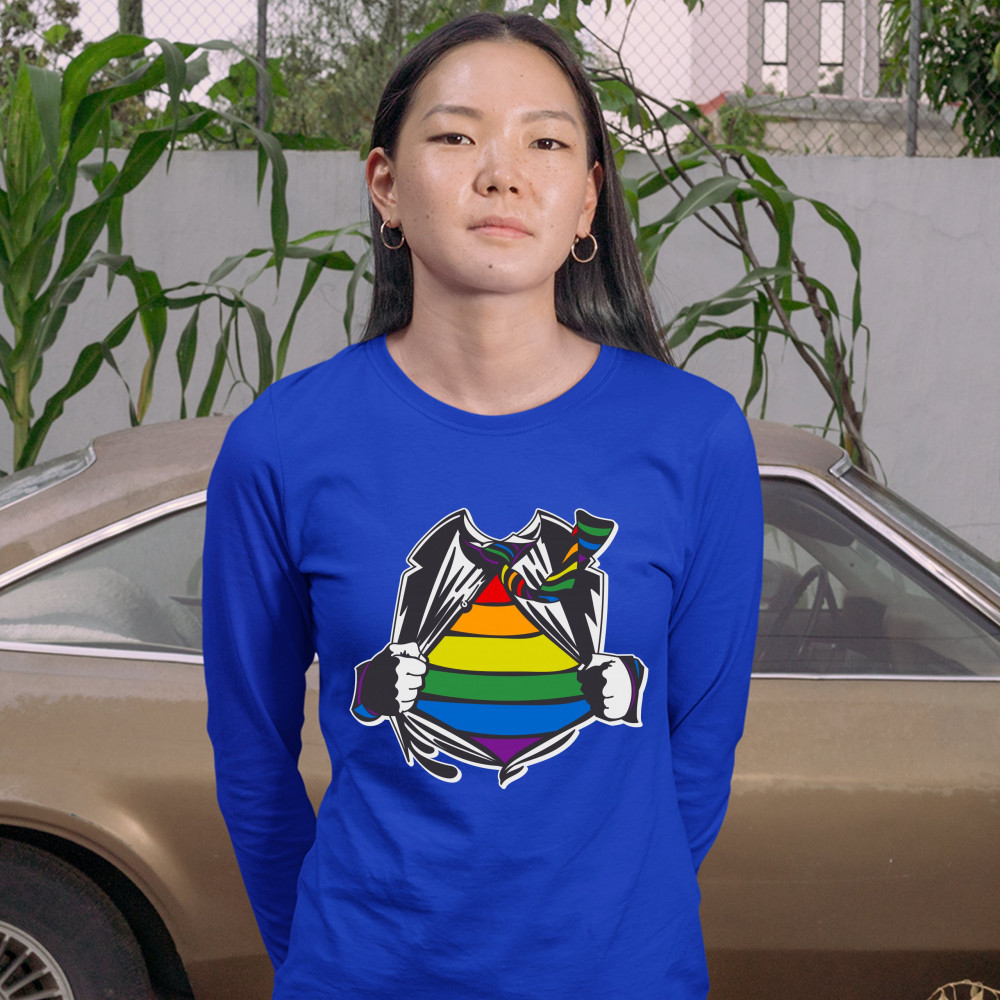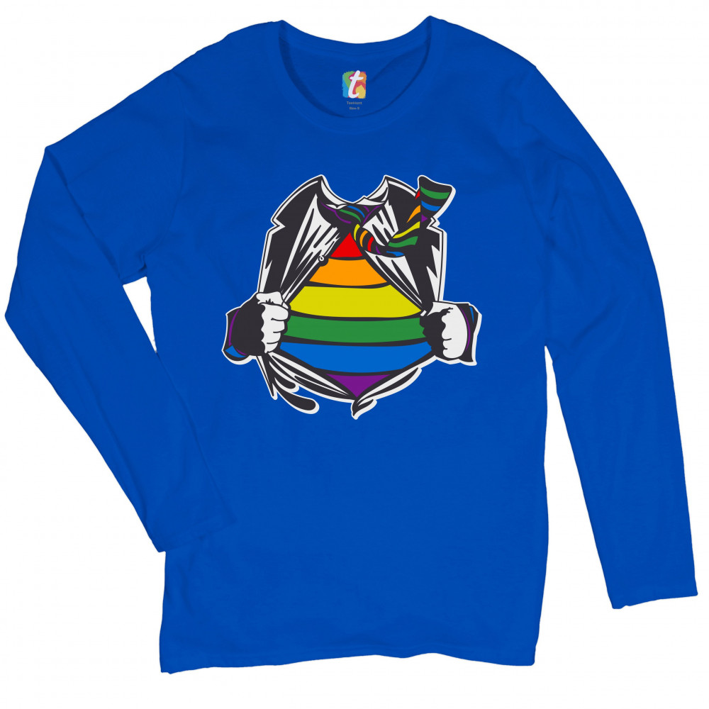 GAY SUPERHERO PARODY women's long sleeve t-shirt lesbian bi transgender rainbow royal blue