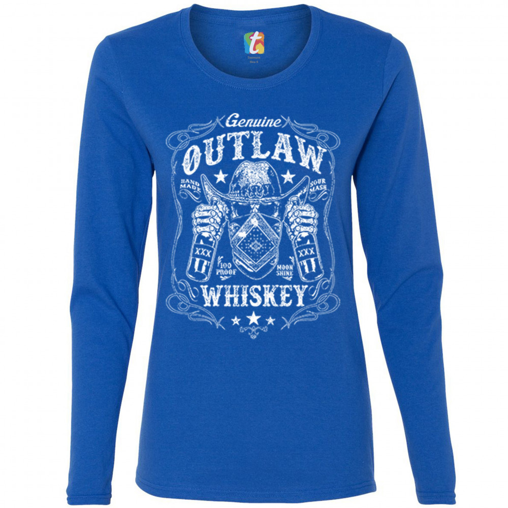 GENUINE OUTLAW WHISKEY women's long sleeve t-shirt sour mash moonshine drinking royal blue
