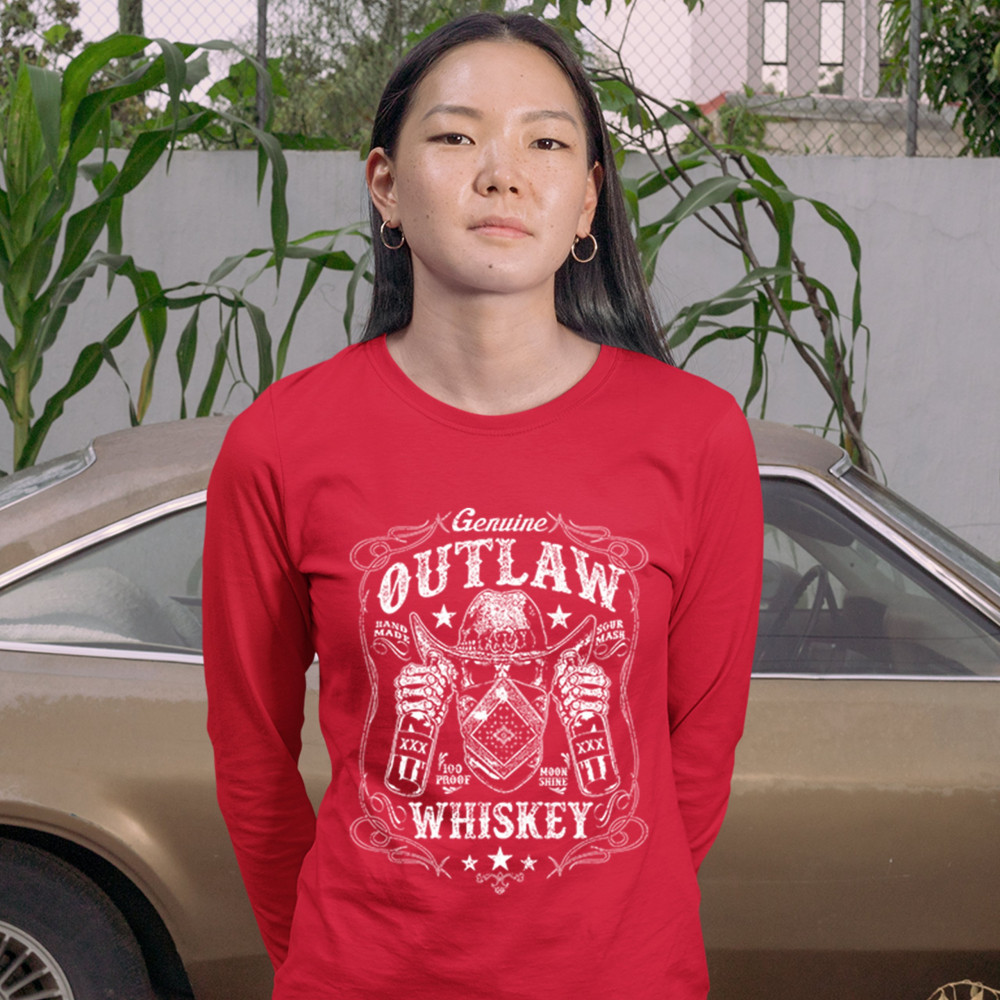 A print featuring a skeleton wearing a bandana and a cowboy hat holding a bottle in each of it's hands. The print says: "Genuine Outlaw Whiskey, Handmade Sour Mash, 100 Proof Moonshine". A great choice for an old school person who doesn't mind a glass or