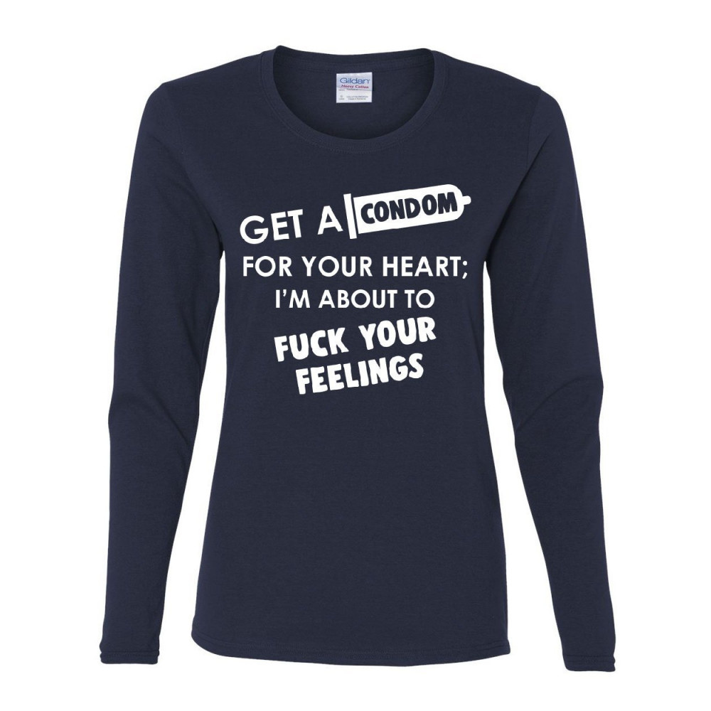GET A CONDOM FOR YOUR HEART women's long sleeve tee funny rude offensive humor navy blue