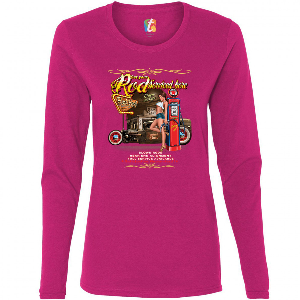 A print featuring a sexy pin-up girl leaning on a gas pump. There is a hot rod behind her and a "Rat Rod Roudhouse" in the background. The print also includes a bunch of innuendos: "get your rod serviced here, blown rods, rear end alignment, full service