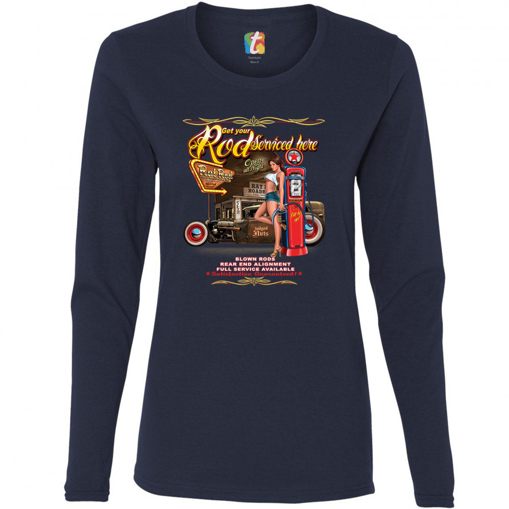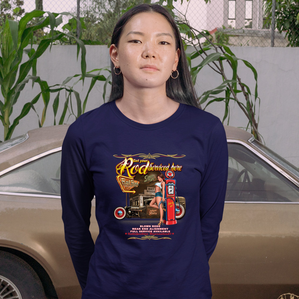 GET YOUR ROD SERVICES HERE women's long sleeve t-shirt route 66 hot rod pin-up navy blue