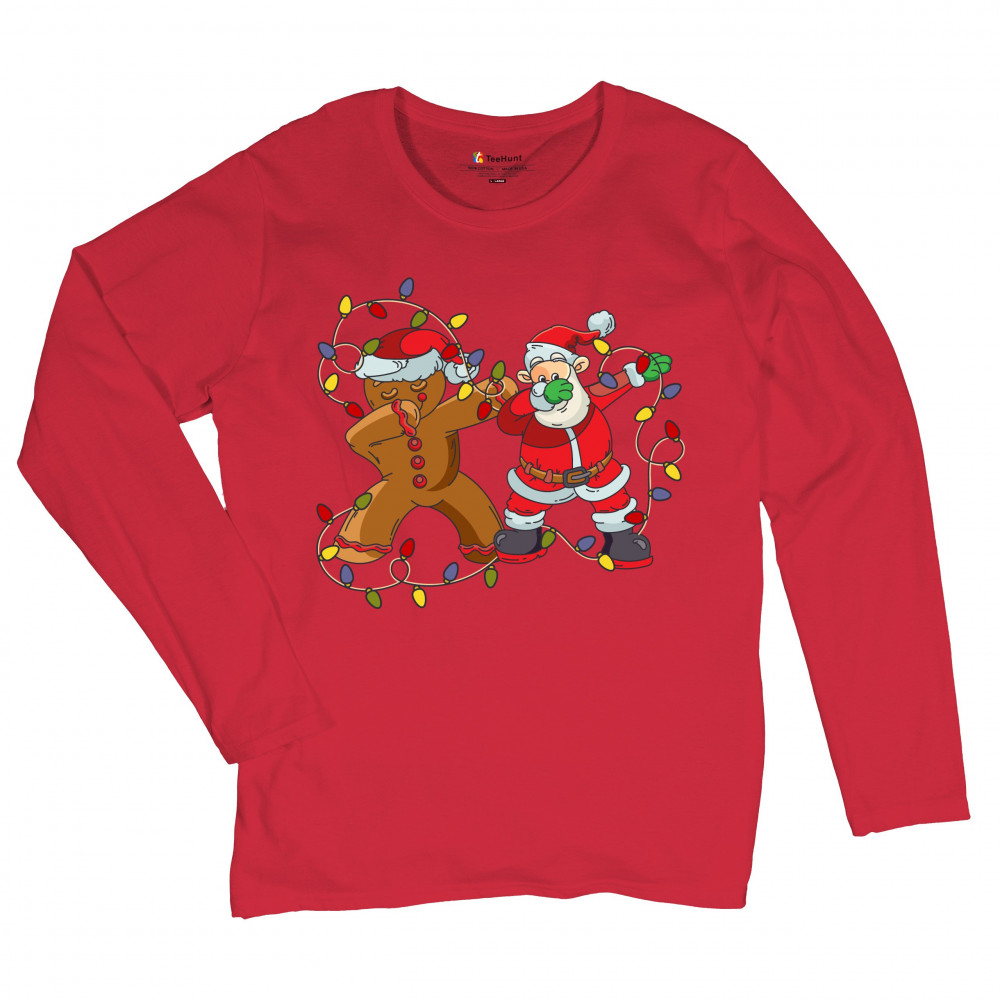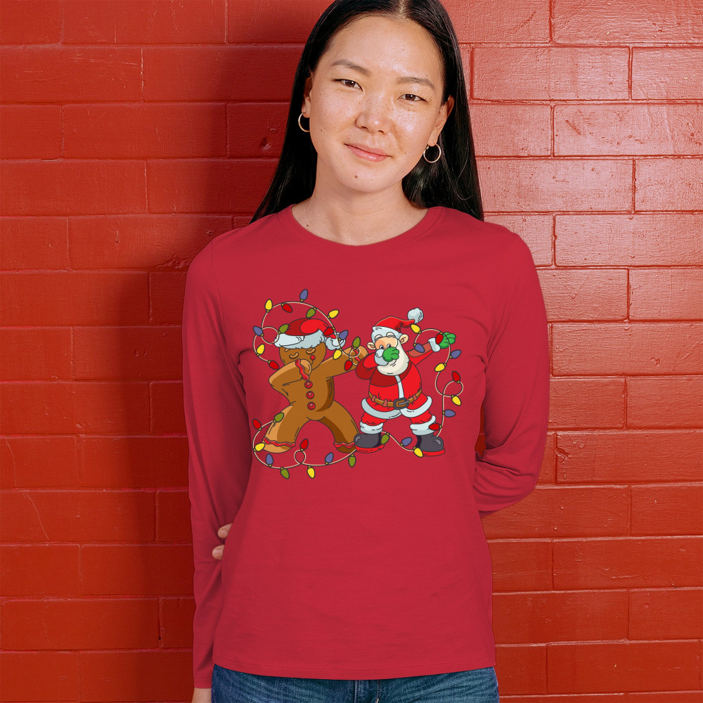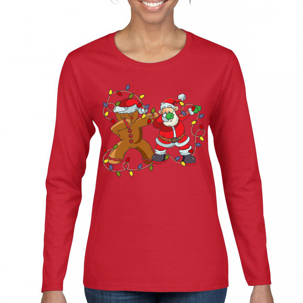 GINGERBREAD MAN AND SANTA CLAUS DAB DANCE women's long sleeve t-shirt christmas red
