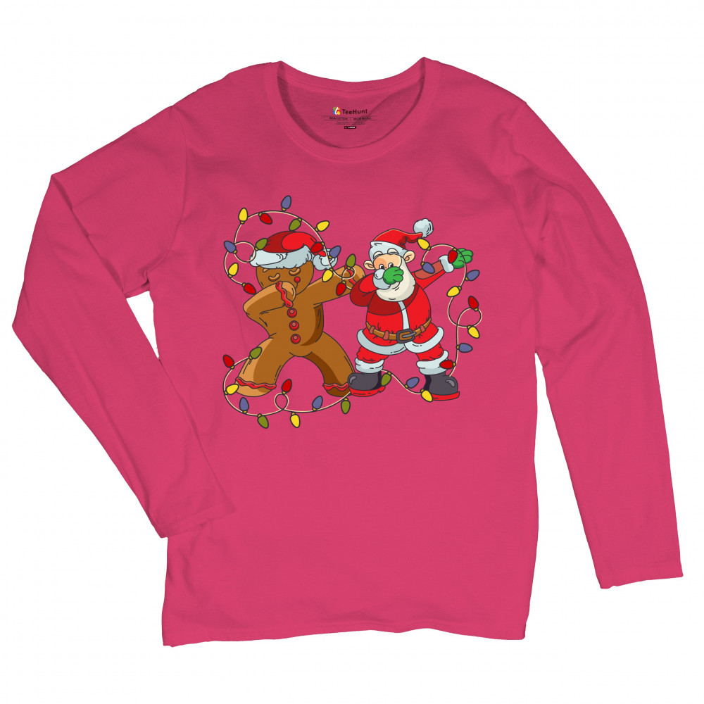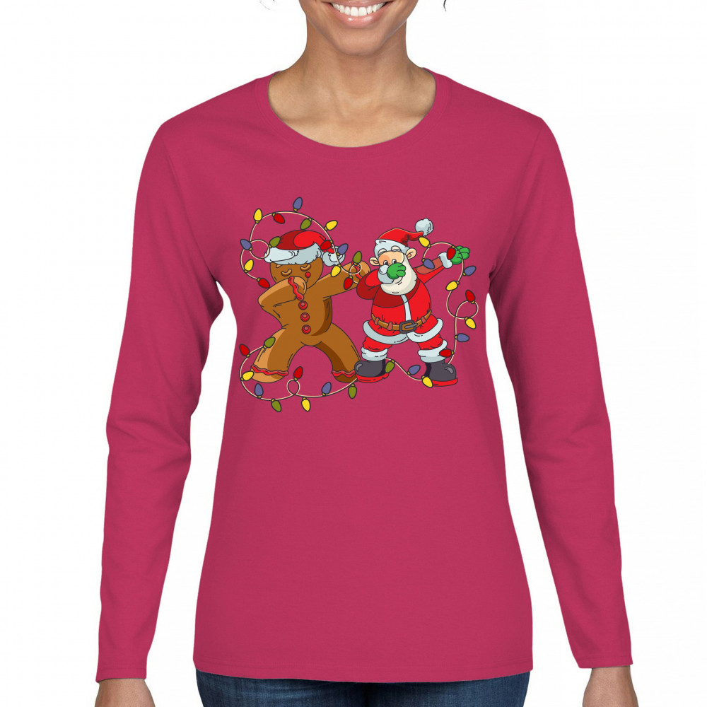 GINGERBREAD MAN AND SANTA CLAUS DAB DANCE women's long sleeve t-shirt christmas pink