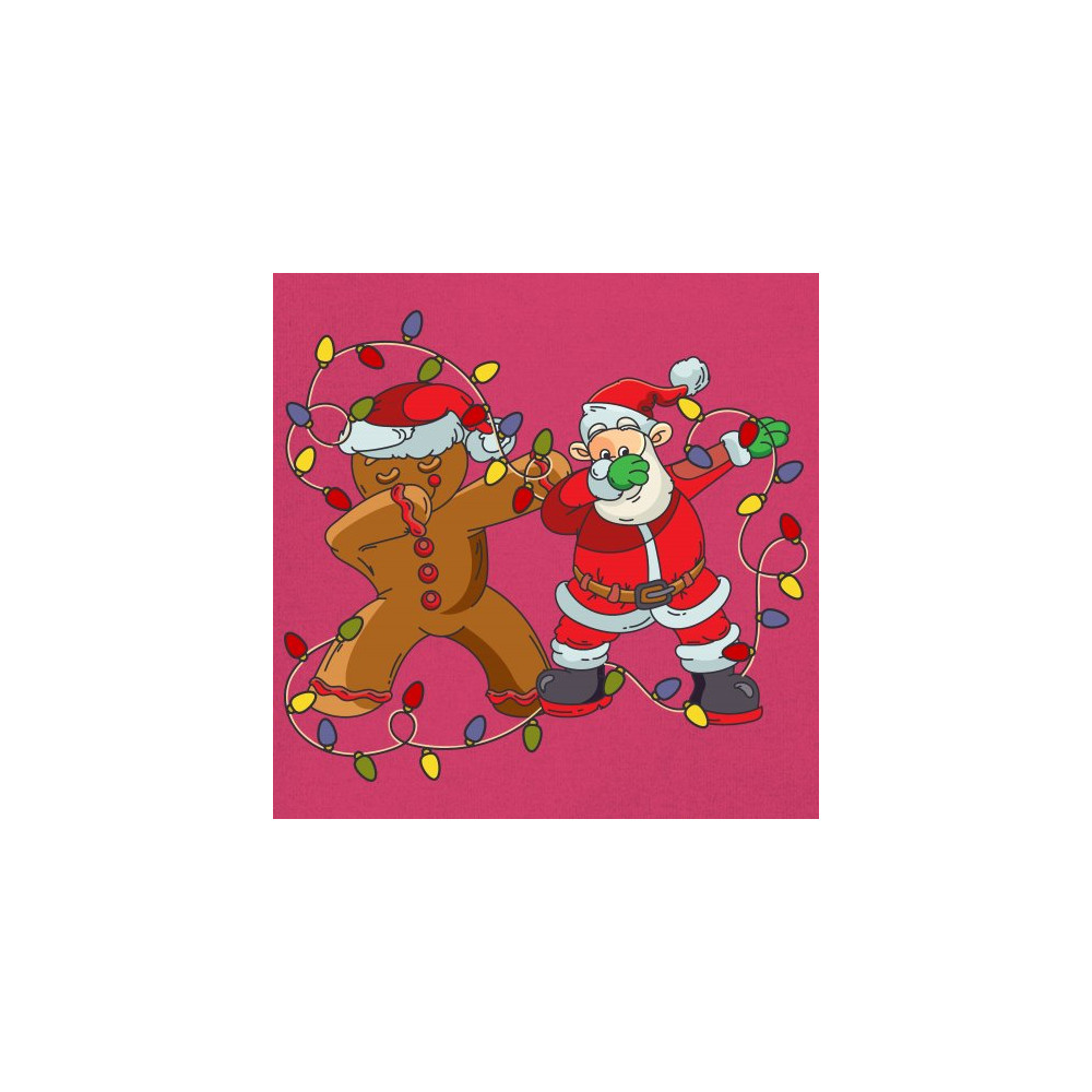 A funny print featuring a gingerbread man and Santa Claus dab dancing while surrounded by Christmas lights. Amazing choice to make people smile and spread positive vibes on Christmas Eve.