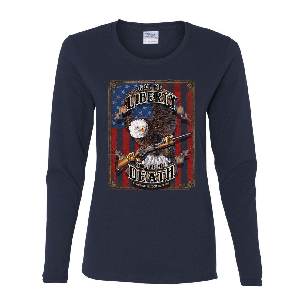 GIVE ME LIBERTY OR GIVE ME DEATH women's long sleeve tee eagle defend freedom 2a navy blue