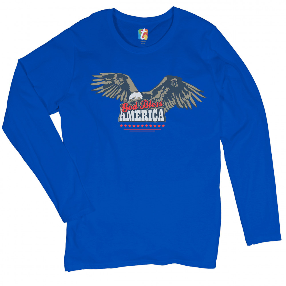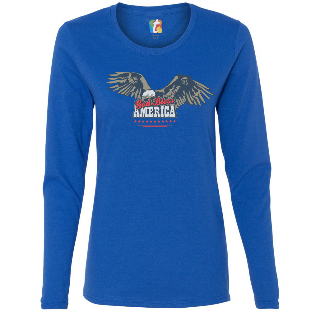 GOD BLESS AMERICA women's long sleeve t-shirt 4th of july bald eagle patriotic royal blue