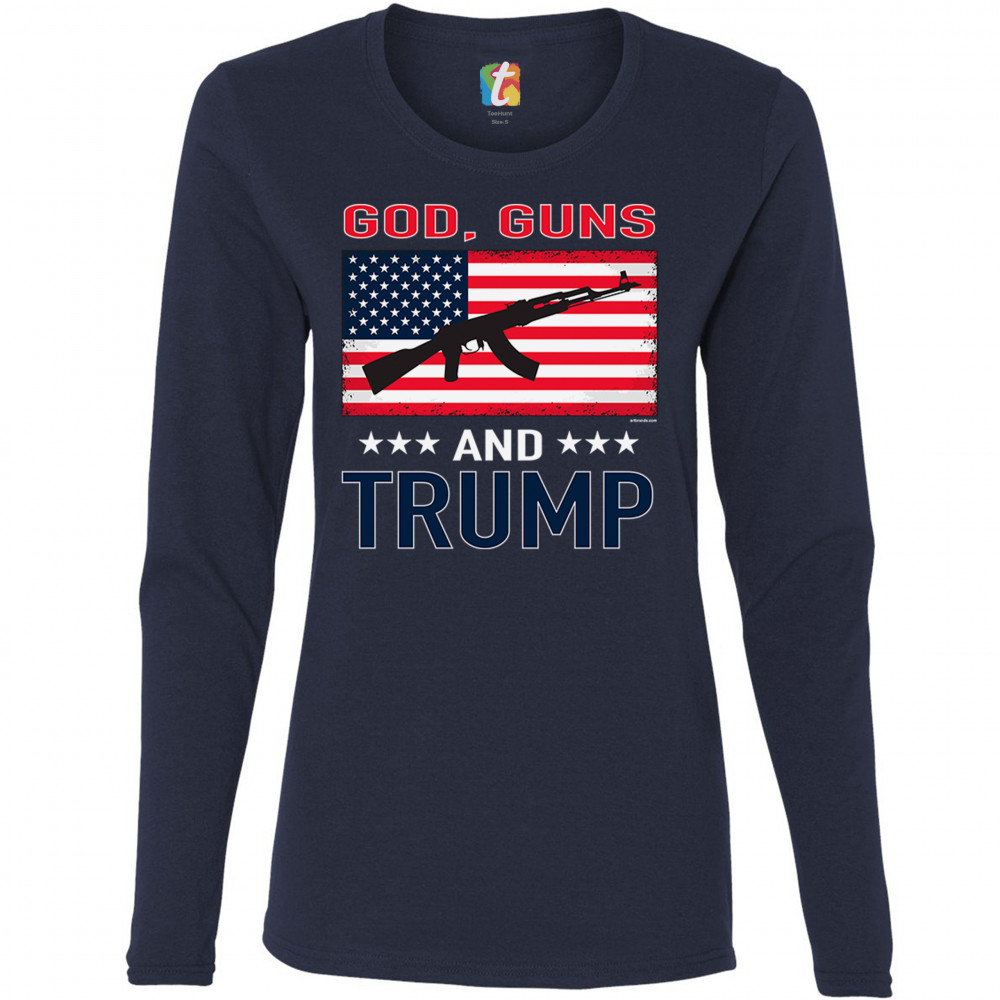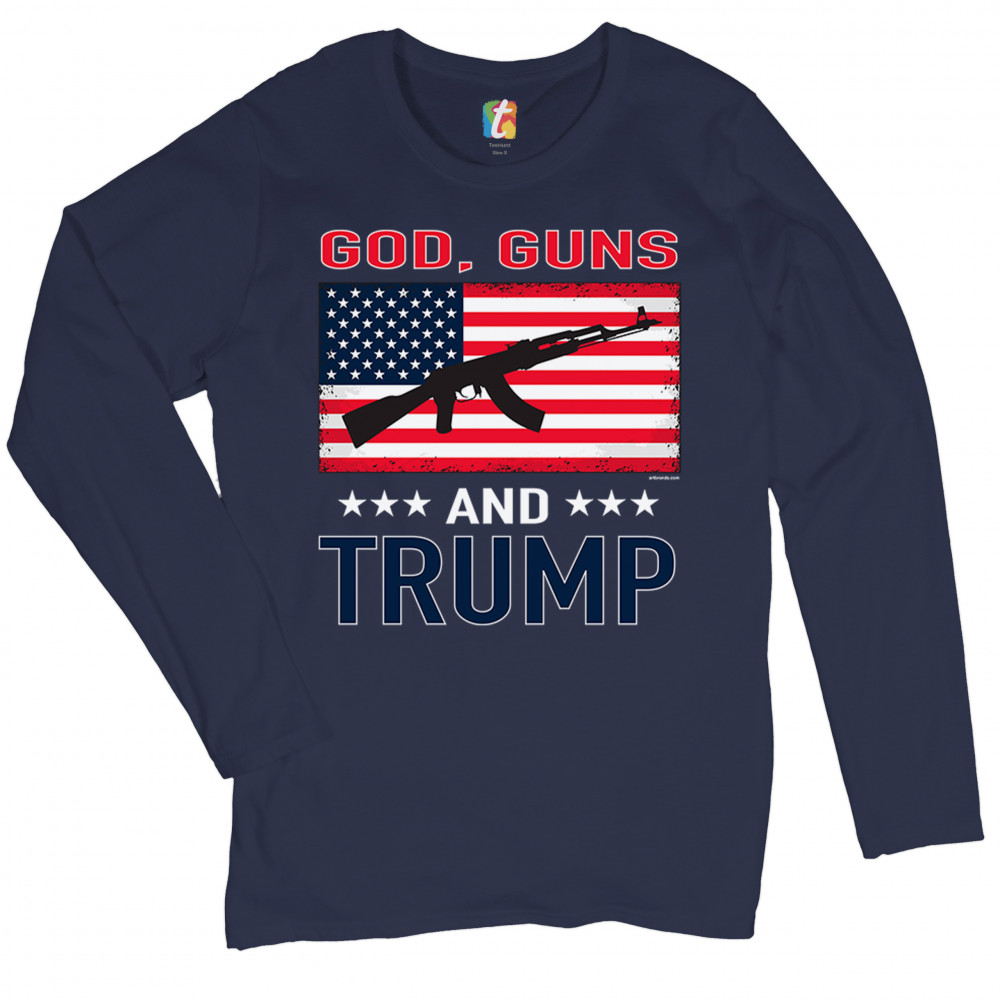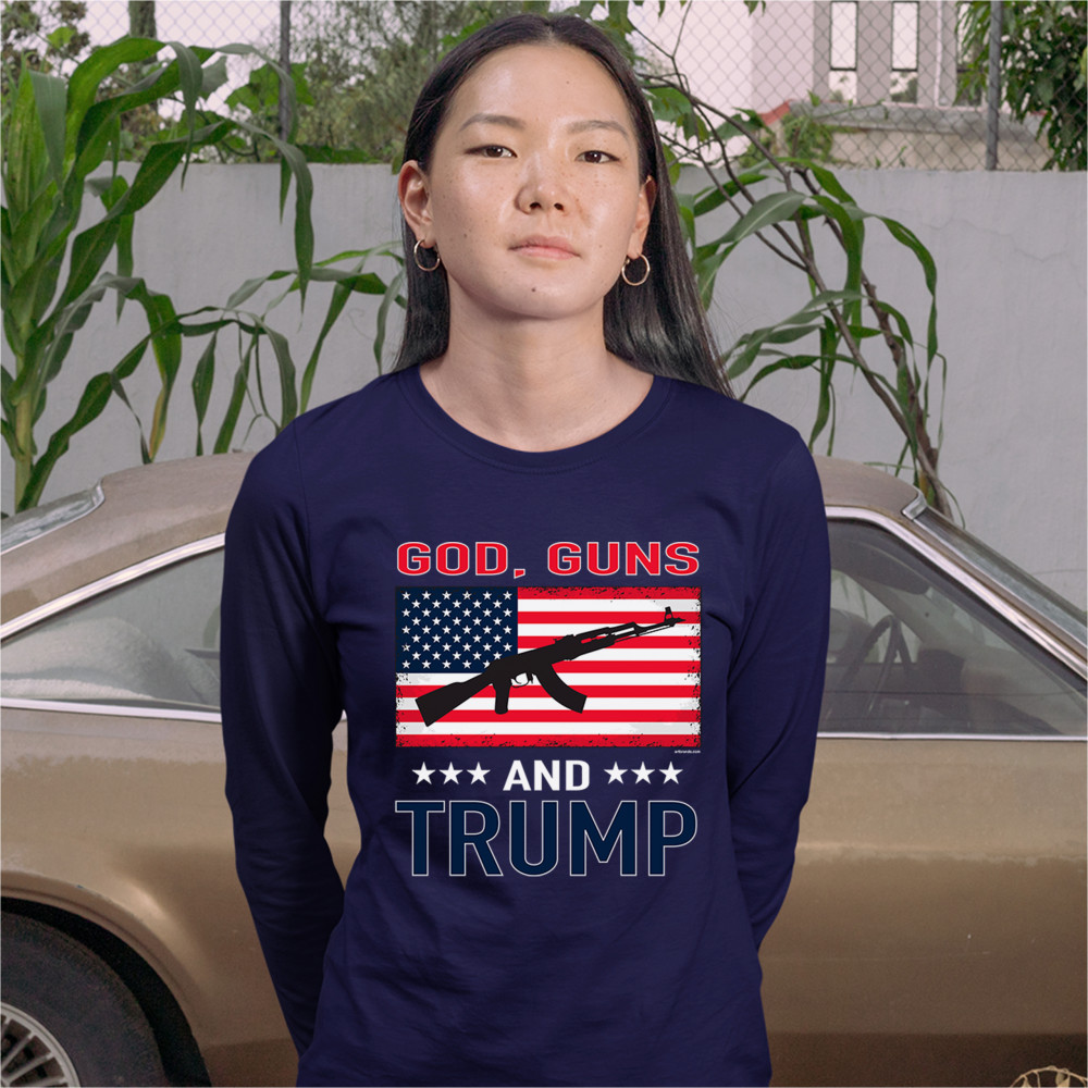 A political print saying "God, Guns and Trump". In the center there is the American flag with a silhouette of AK-47 rifle on it. A great choice to wear for a Trump rally or give as a gift to a Donald Trump and Mike Pence supporter before 2020 presidential elections.