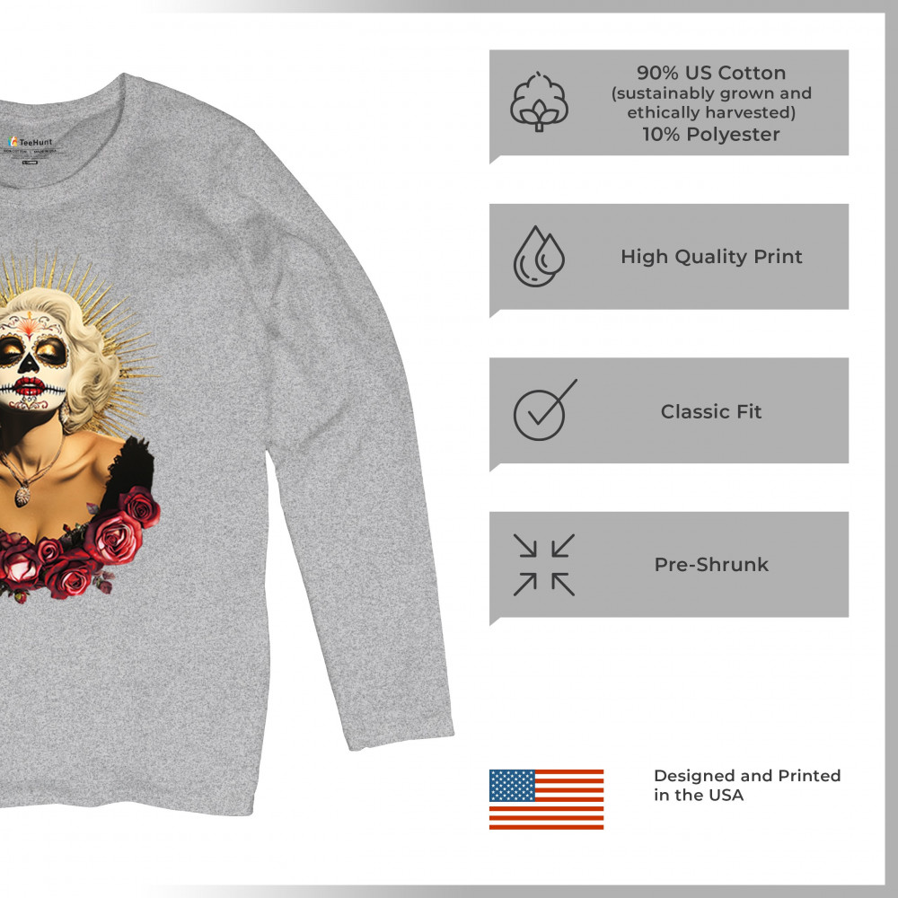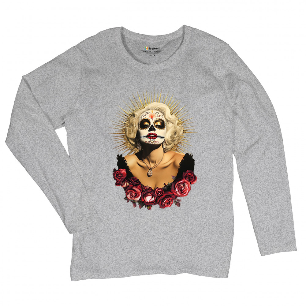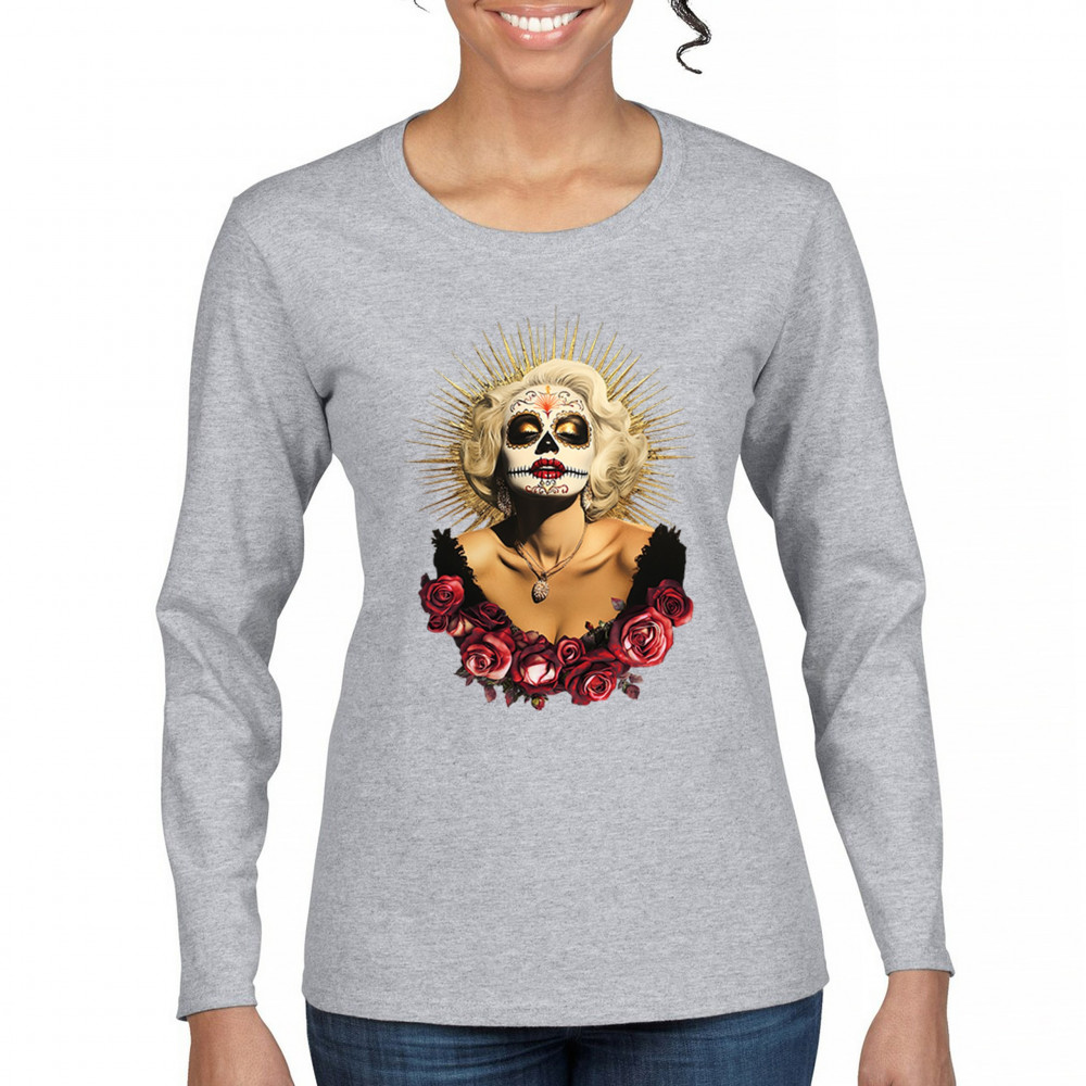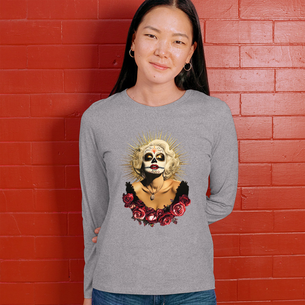 This bold and beautiful sugar skull design features a glamorous calavera woman crowned in a golden halo and framed by roses. A divine tribute to Dia de los Muertos, this look blends vintage glam, Latin culture, makeup artistry, and sacred symbolism. Perfect for fans of gothic beauty, Halloween, and heritage expression.