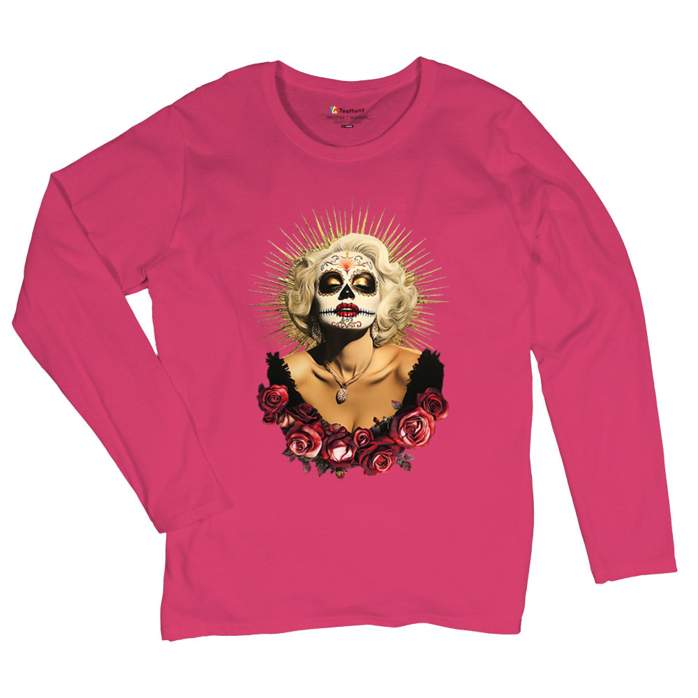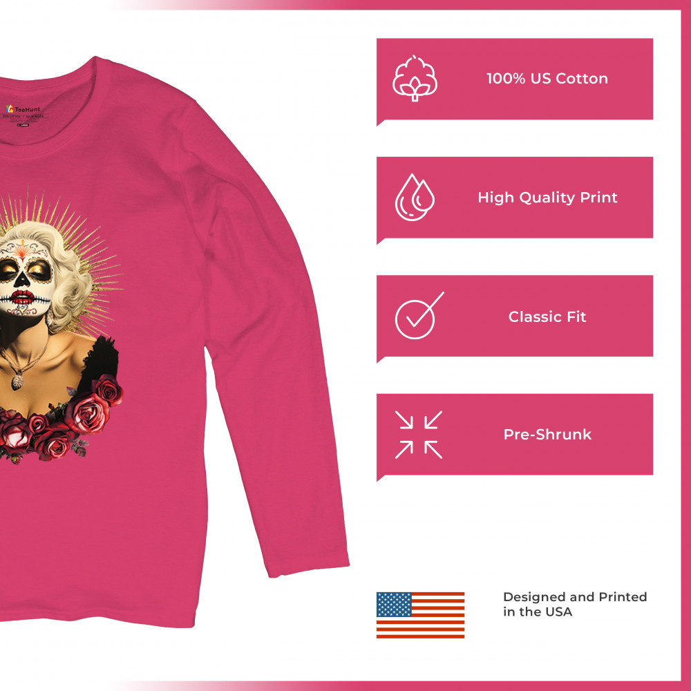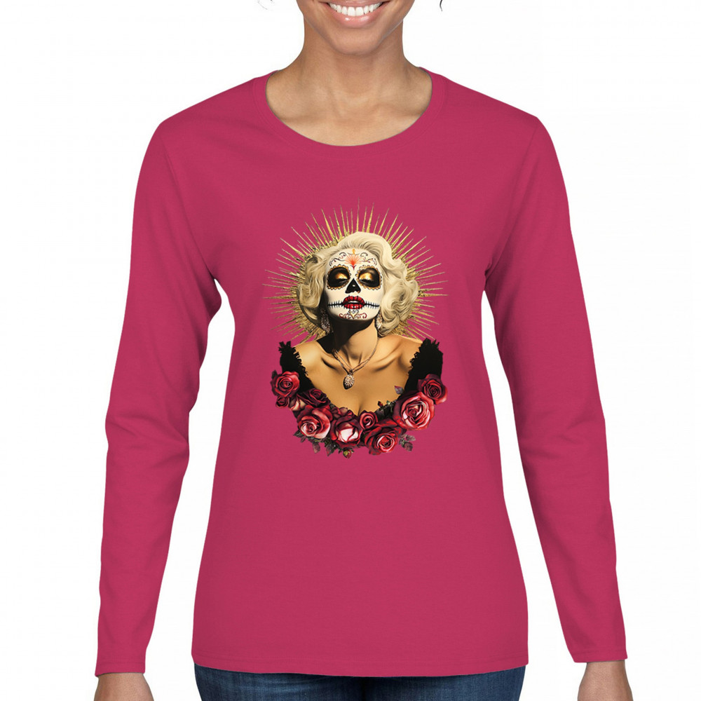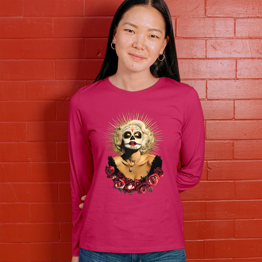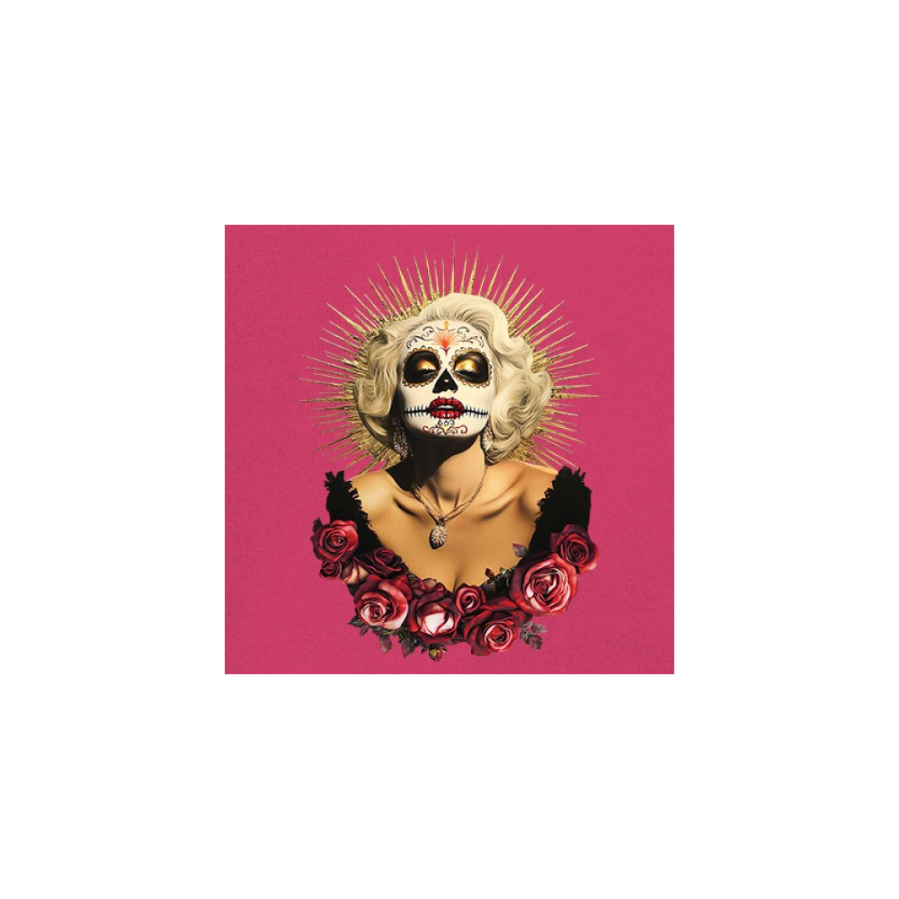 This bold and beautiful sugar skull design features a glamorous calavera woman crowned in a golden halo and framed by roses. A divine tribute to Dia de los Muertos, this look blends vintage glam, Latin culture, makeup artistry, and sacred symbolism. Perfect for fans of gothic beauty, Halloween, and heritage expression.