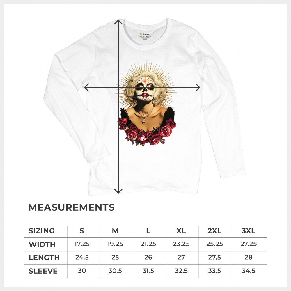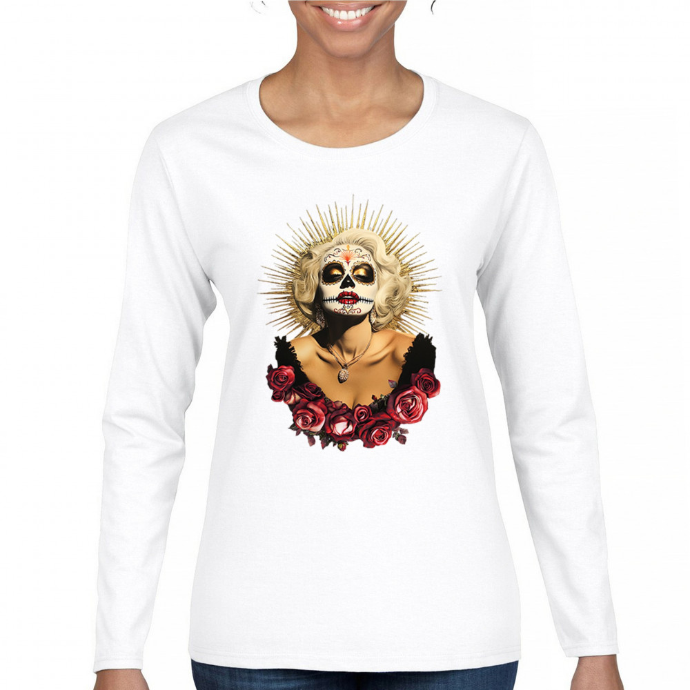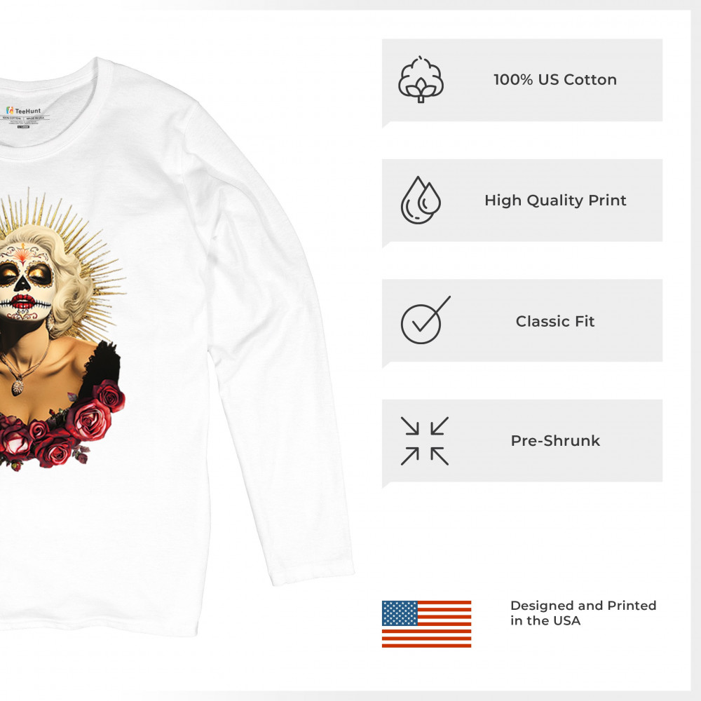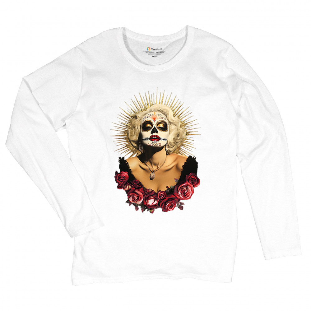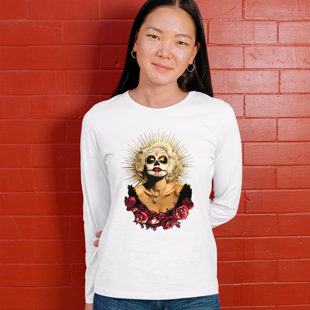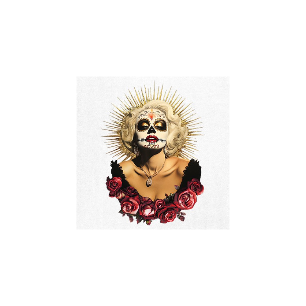 This bold and beautiful sugar skull design features a glamorous calavera woman crowned in a golden halo and framed by roses. A divine tribute to Dia de los Muertos, this look blends vintage glam, Latin culture, makeup artistry, and sacred symbolism. Perfect for fans of gothic beauty, Halloween, and heritage expression.