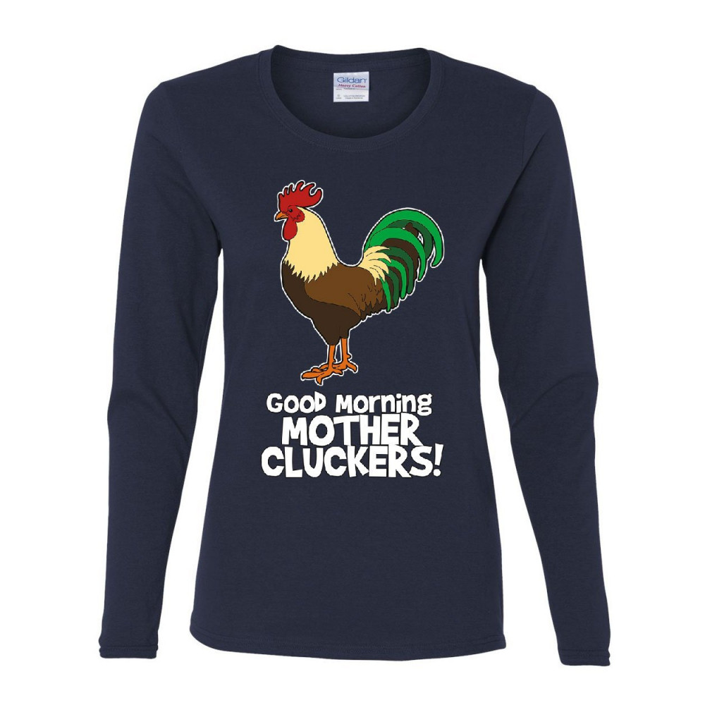 GOOD MORNING MOTHER CLUCKERS women's long sleeve tee funny adult humor rooster navy blue