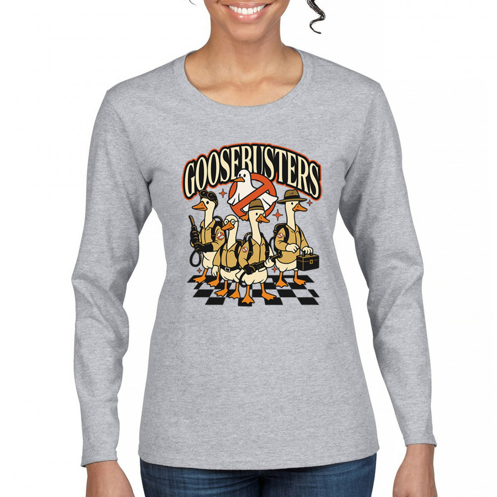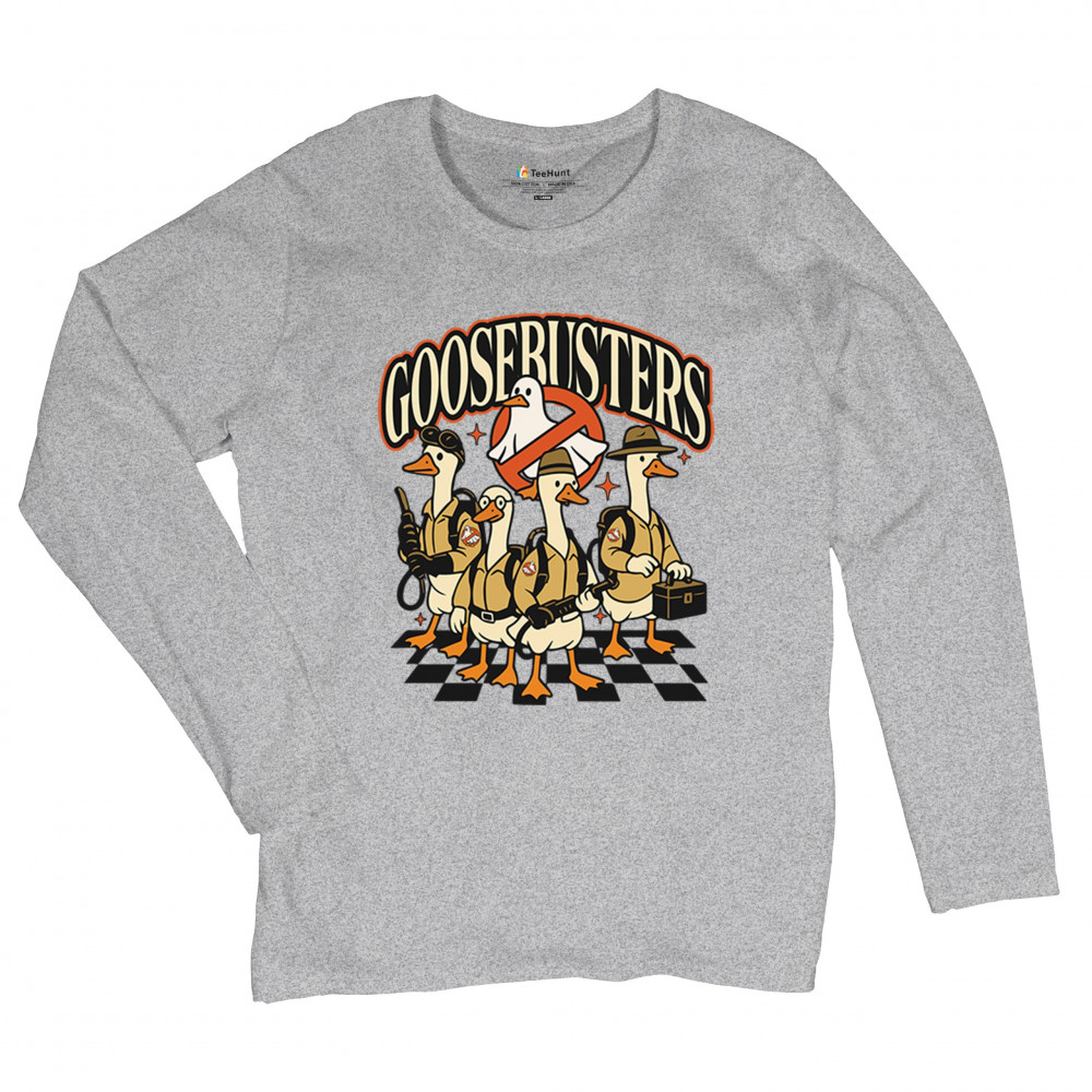 Goosebusters Halloween goose parody shirt – spooky goose design with silly goose humor, comedy bird style, Trick or Treat fun, and creepy night vibes.