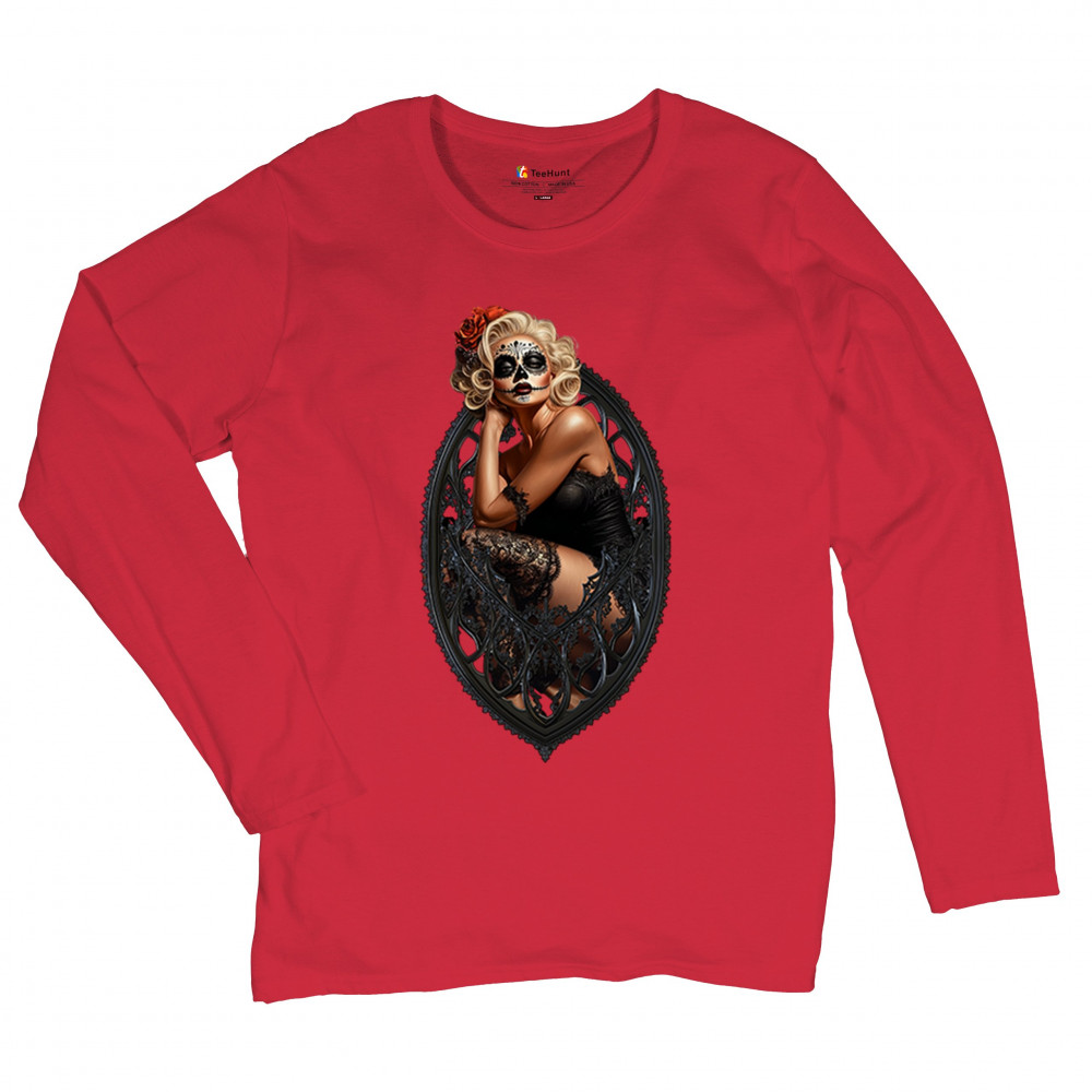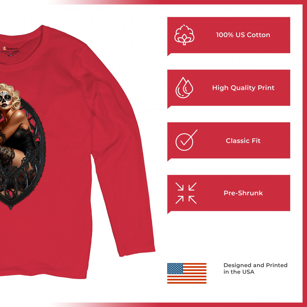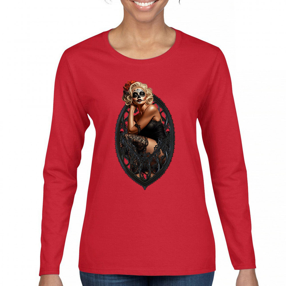 This sultry sugar skull pinup design blends gothic lace, seductive pose, and ornate frame detail for a bold Day of the Dead tribute. With striking makeup and vintage lingerie styling, it’s perfect for fans of macabre fashion, calavera art, and dark romance. A hauntingly beautiful mix of allure, attitude, and Dia de los Muertos charm.