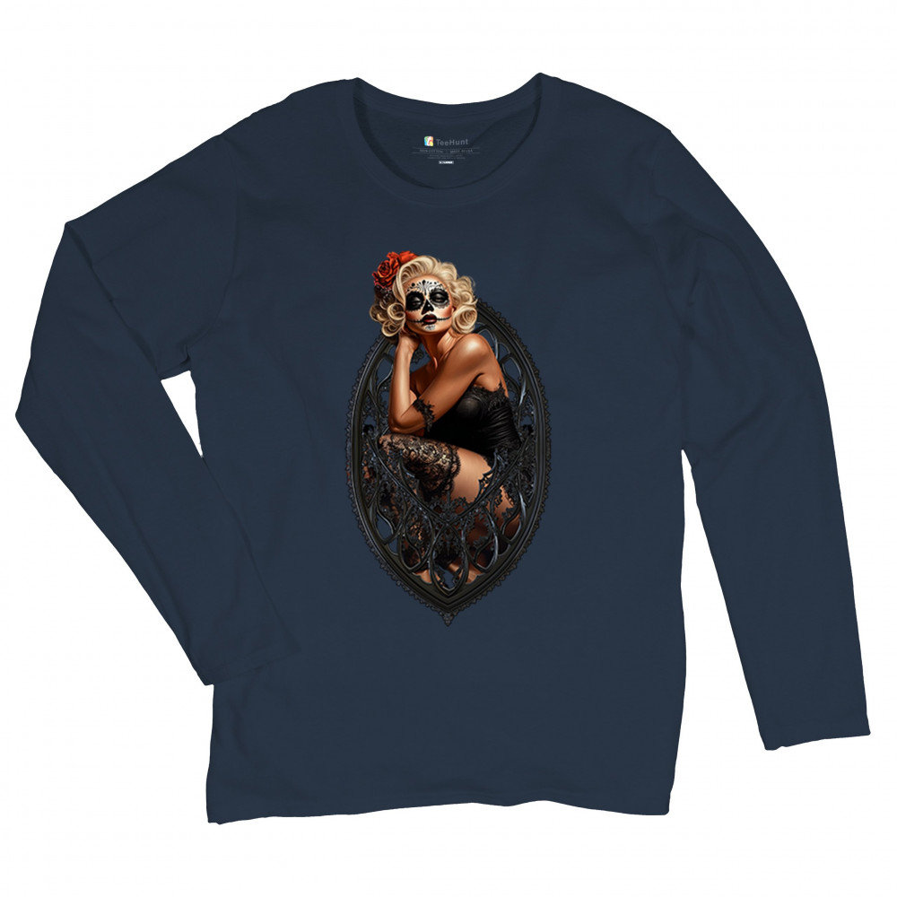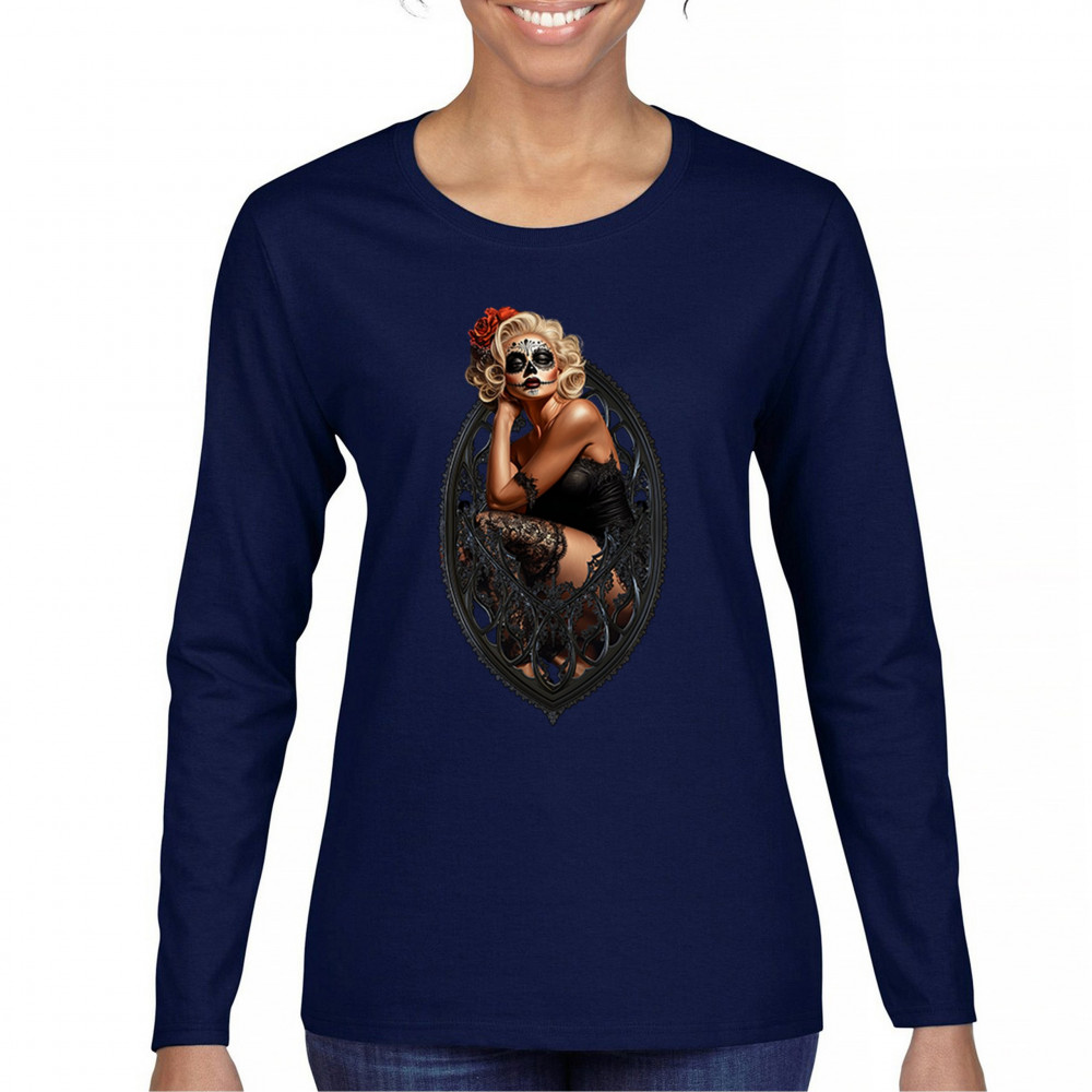 This sultry sugar skull pinup design blends gothic lace, seductive pose, and ornate frame detail for a bold Day of the Dead tribute. With striking makeup and vintage lingerie styling, it’s perfect for fans of macabre fashion, calavera art, and dark romance. A hauntingly beautiful mix of allure, attitude, and Dia de los Muertos charm.